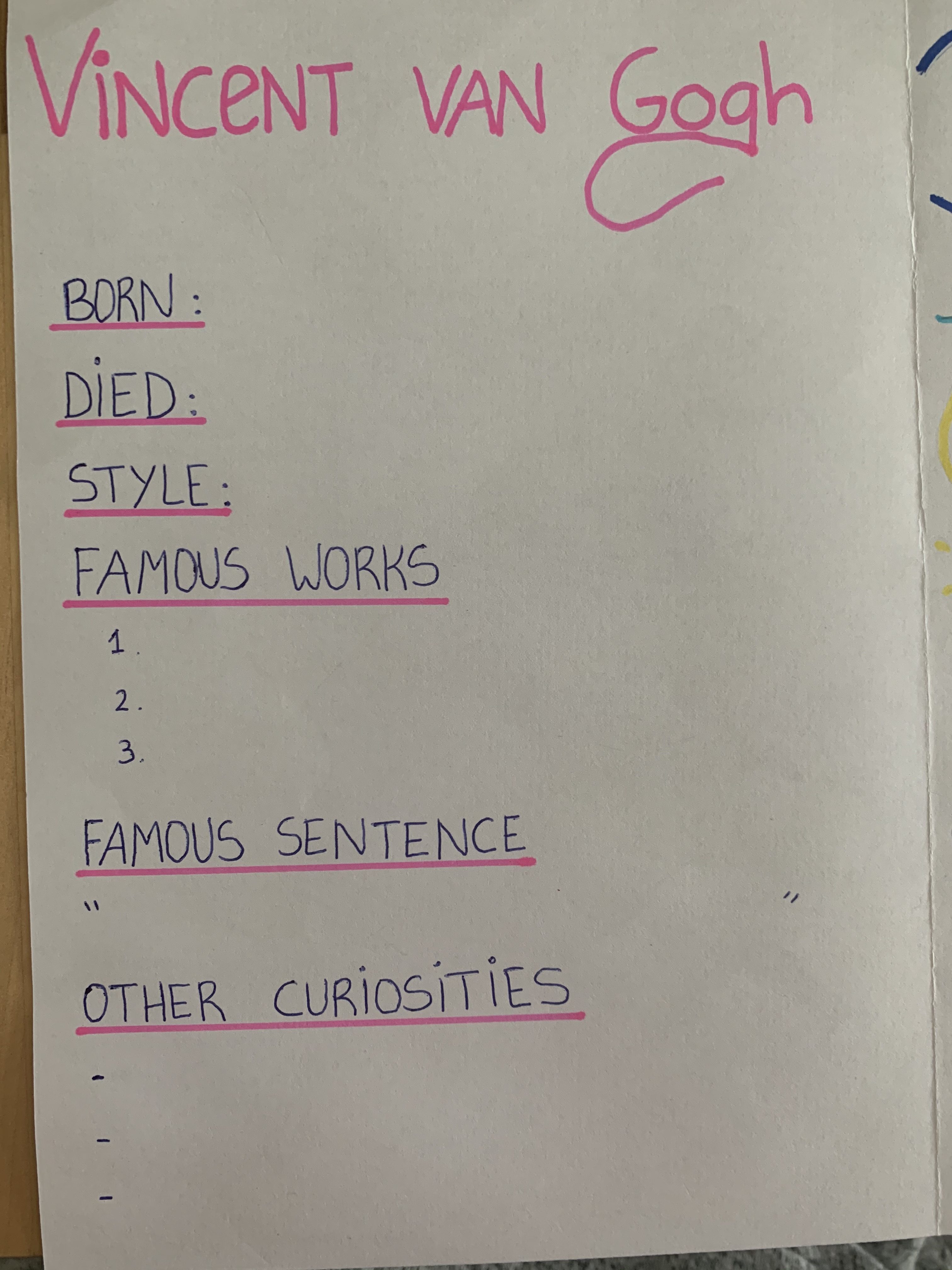 “Born” vol dir on i quan va néixer, per exemple. Doncs per poder posar la informació de cada espai, heu d’anar al següent web i hi trobareu tota la informació. Excepte la “famous sentence” que ho haureu de buscar a Google posant: frases Van gogh