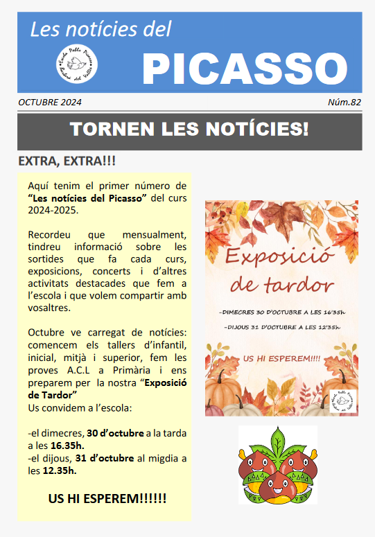 Per fer aquesta exposició estem preparant diferents treballs plàstics a tota l’escola (Land Art a Educació Infantil, la tardor a Catalunya a Cicle Inicial i Cicle Mitjà, Escape Room i la tardor a altres països a Cicle Superior, Halloween a les classes d’anglès…) i necessitem la vostra col·laboració: