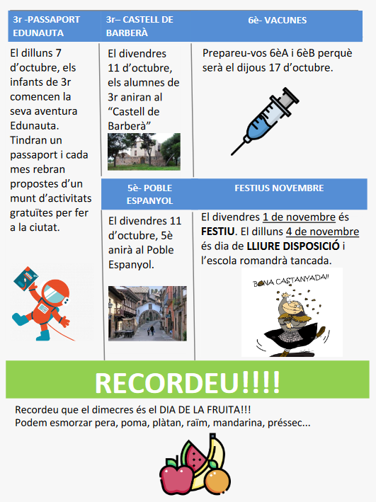 Us recordem que el proper divendres, 1 de novembre és FESTIU i el dilluns, 4 de novembre és DIA DE LLIURE DISPOSICIÓ i l’escola romandrà TANCADA.