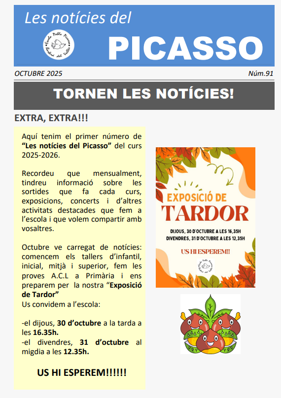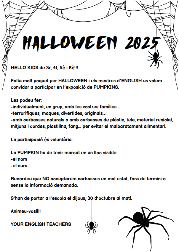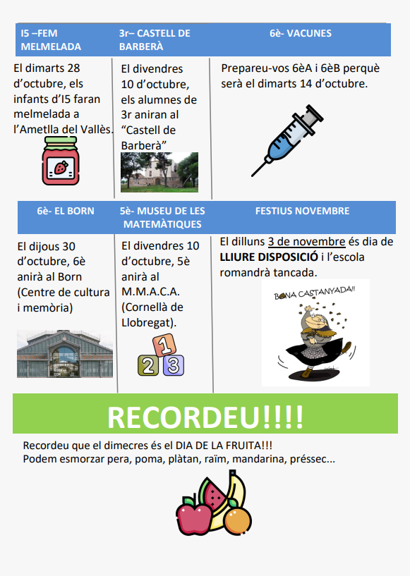 29/10/25Us recordem que el proper dilluns, 3 de novembre és DIA DE LLIURE DISPOSICIÓ i l’escola romandrà TANCADA.