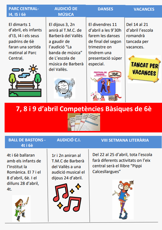 Recordeu que l’escola romandrà tancada del 14 al 21 d’abril. Ens tornem a trobar el dimarts 22 d’abril!!!