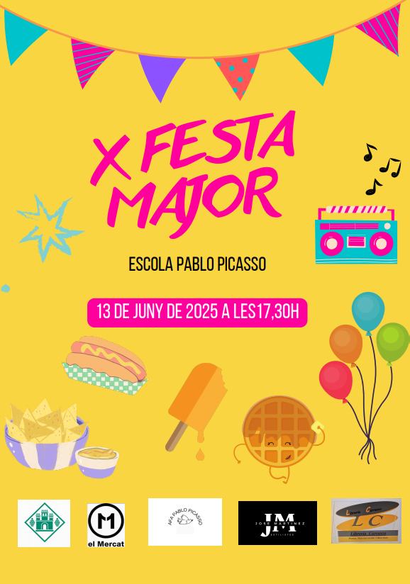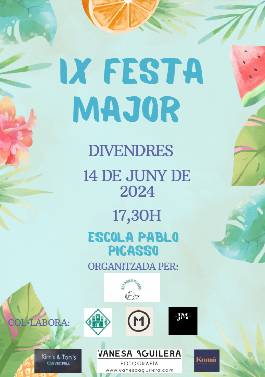 Ja ten-im aquí la IX Festa major!!! El dia 14 de juny a la nostra Escola Pablo Picasso de 17,30 a 22.30 h!! Una vegada més, L’AFA organitza la NOVENA edició de la Festa Major de l’Escola Pablo Picasso, amb la col·laboració de l’Escola, i la participació de pares, mares i mestres, per acomiadar el curs de la millor manera possible. Tindrem jocs, inflables, música, tallers i sopar de germanor. Per poder assistir, tots els infants, socis o no, han de portar la seva entrada/polsera.