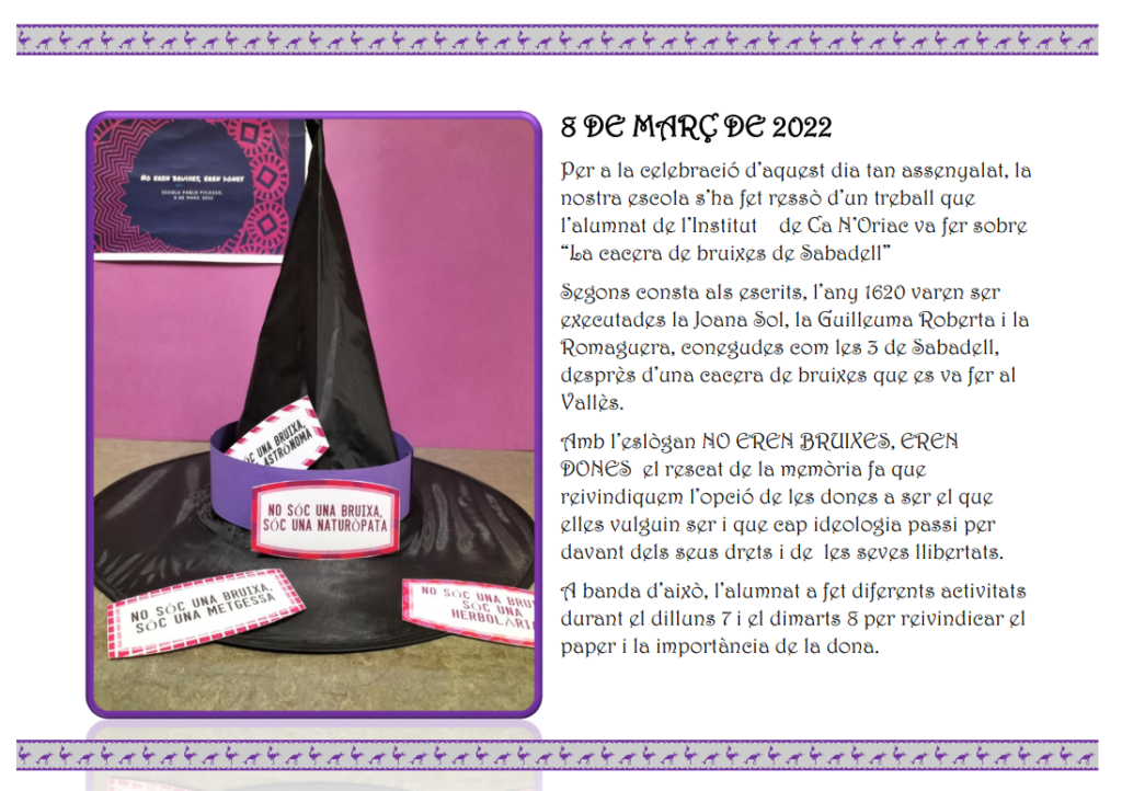 Per a la celebració d’aquest dia tan assenyalat, la nostra escola s’ha fet ressò d’un treball que l’alumnat de l’Institut de Ca N’Oriac va fer sobre “La cacera de bruixes de Sabadell”