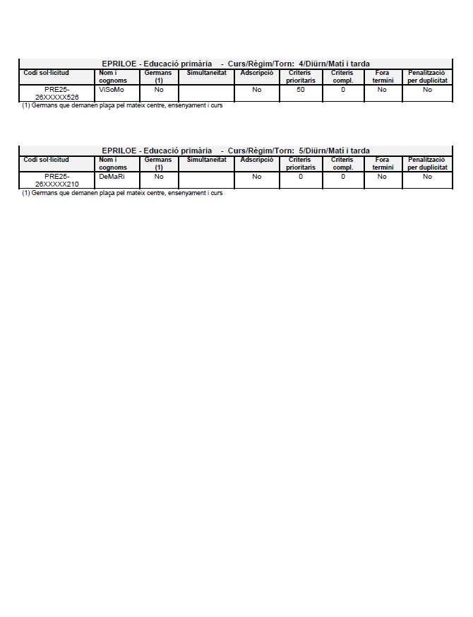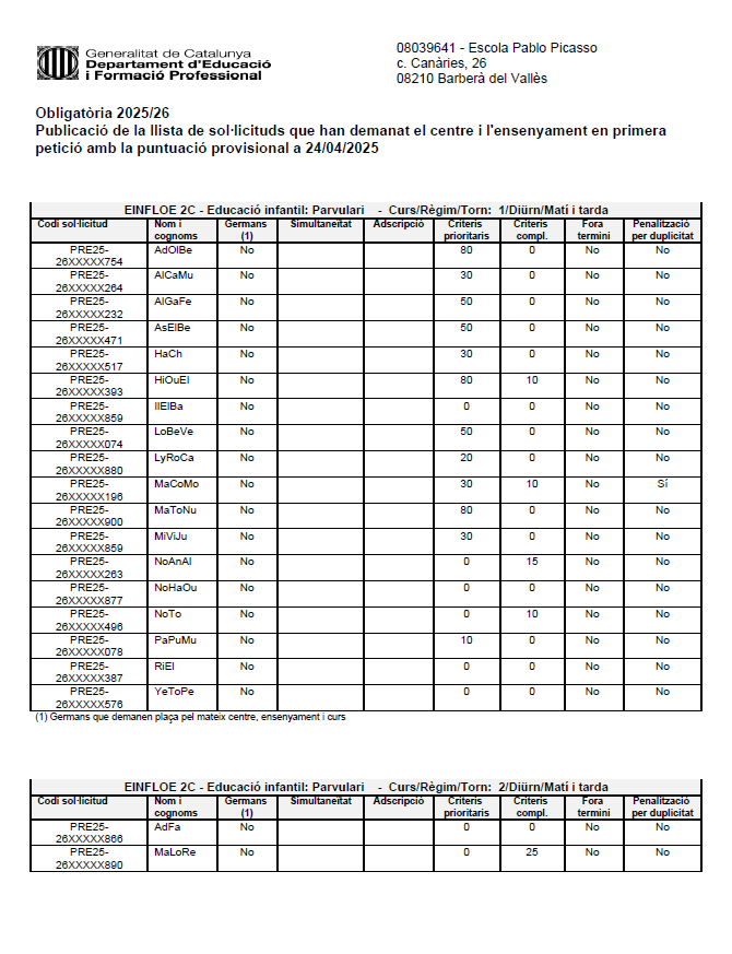 Barem provisional Publicació de la llista de sol·licituds que han demanat el centre i l’ensenyament en primera petició amb la puntuació provisional a 24/4/2025