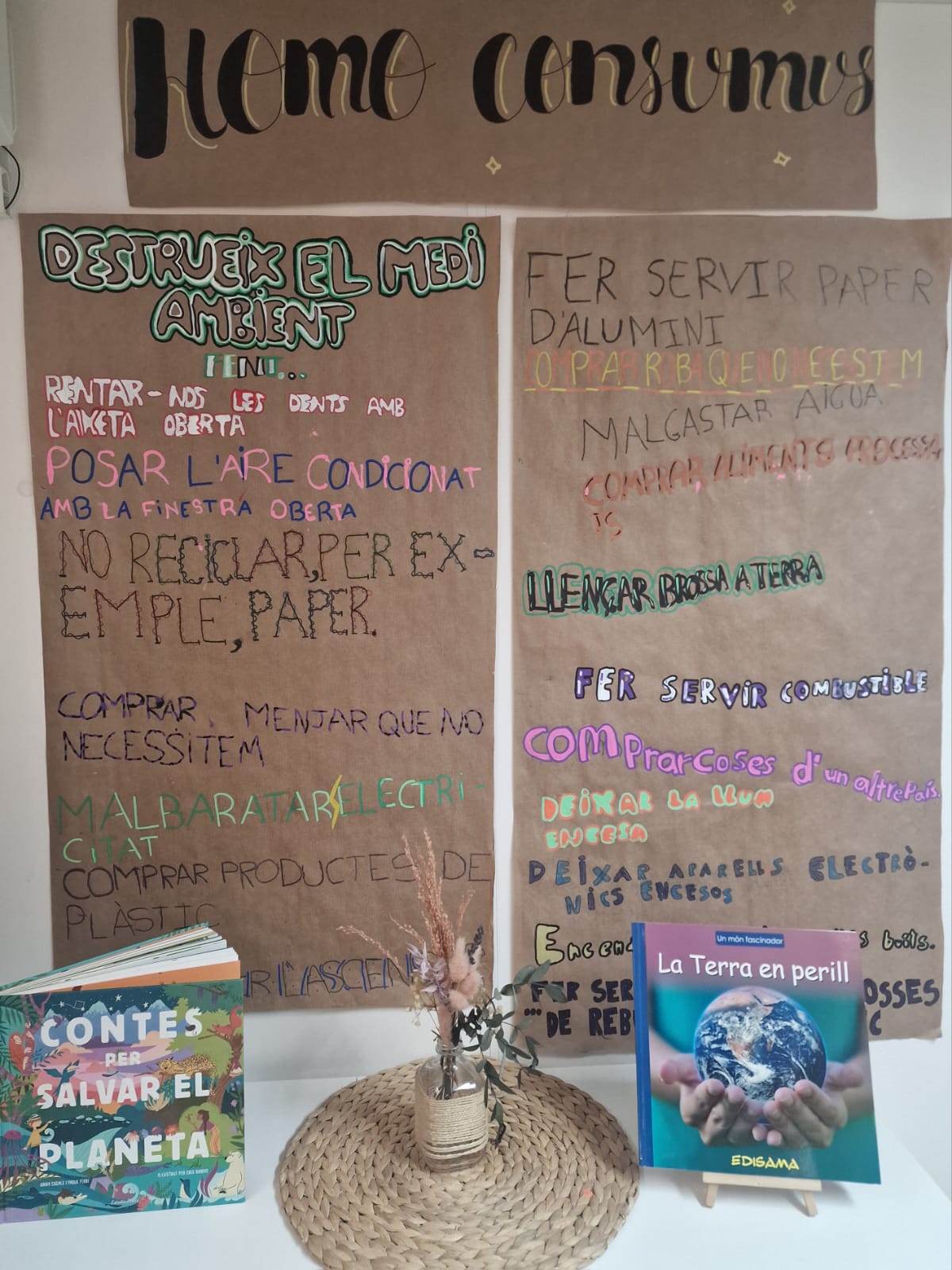 Durant les primeres setmanes, vam descobrir què és el consum responsable, vam aprendre sobre les 5Rs (Reduir, Reutilitzar, Reciclar, Reparar i Repensar), vam identificar aquelles pràctiques que destrueixen el medi ambient, com la generació excessiva de brossa i l’ús elevat d’energia, que contribueixen al canvi climàtic, i vam crear dos decàlegs gegants, un amb accions que poden ajudar-nos a protegir el medi ambient i un altre amb aquelles accions que caldria revertir. També vam conèixer el paper de les activistes mediambientals i cada equip va escollir-ne una per fer un text biogràfic.