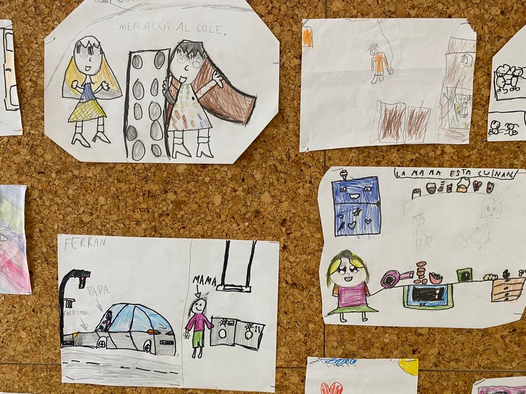 A les aules de segon ens han reflexionat sobre la importància d’estar presents en la criança dels infants. En molts casos trobem absència de la figura masculina. La idea és aconseguir que expressin com els seus referents masculins tenen cura d’ells i com expressen les emocions. A partir d’un dibuix d’una escena quotidiana, cada alumne ha expressat i compartir la seva vivència. Han vist la importància de dir-nos les coses maques i de donar valor a la cura.