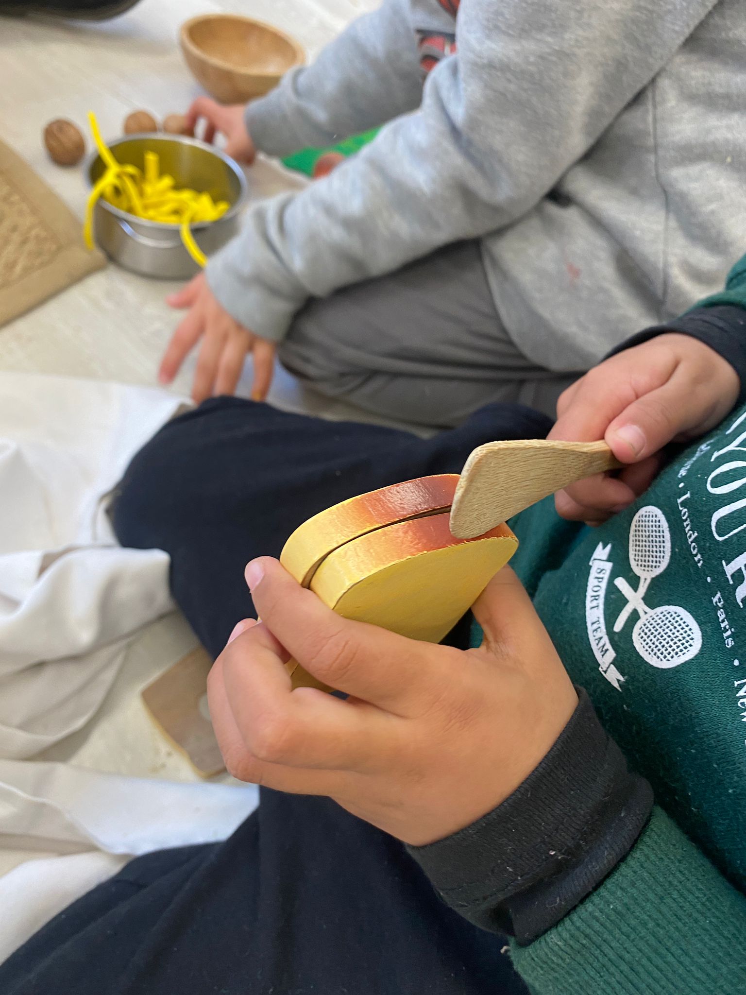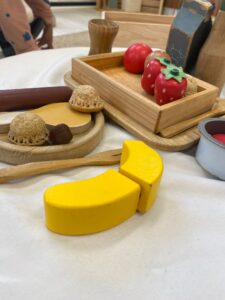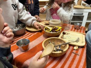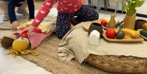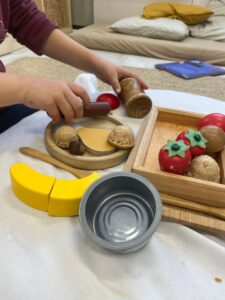 Els infants a 3 anys inicien el joc de manera individual i, a poc a poc, fan un joc més compartit. Cada infant representa la seva història, recreant gestos, moviments i converses a partir de diferents materials. Capses de fusta, bols i elements naturals, entre d’altres, es transformen en un espai de restaurant i caseta.