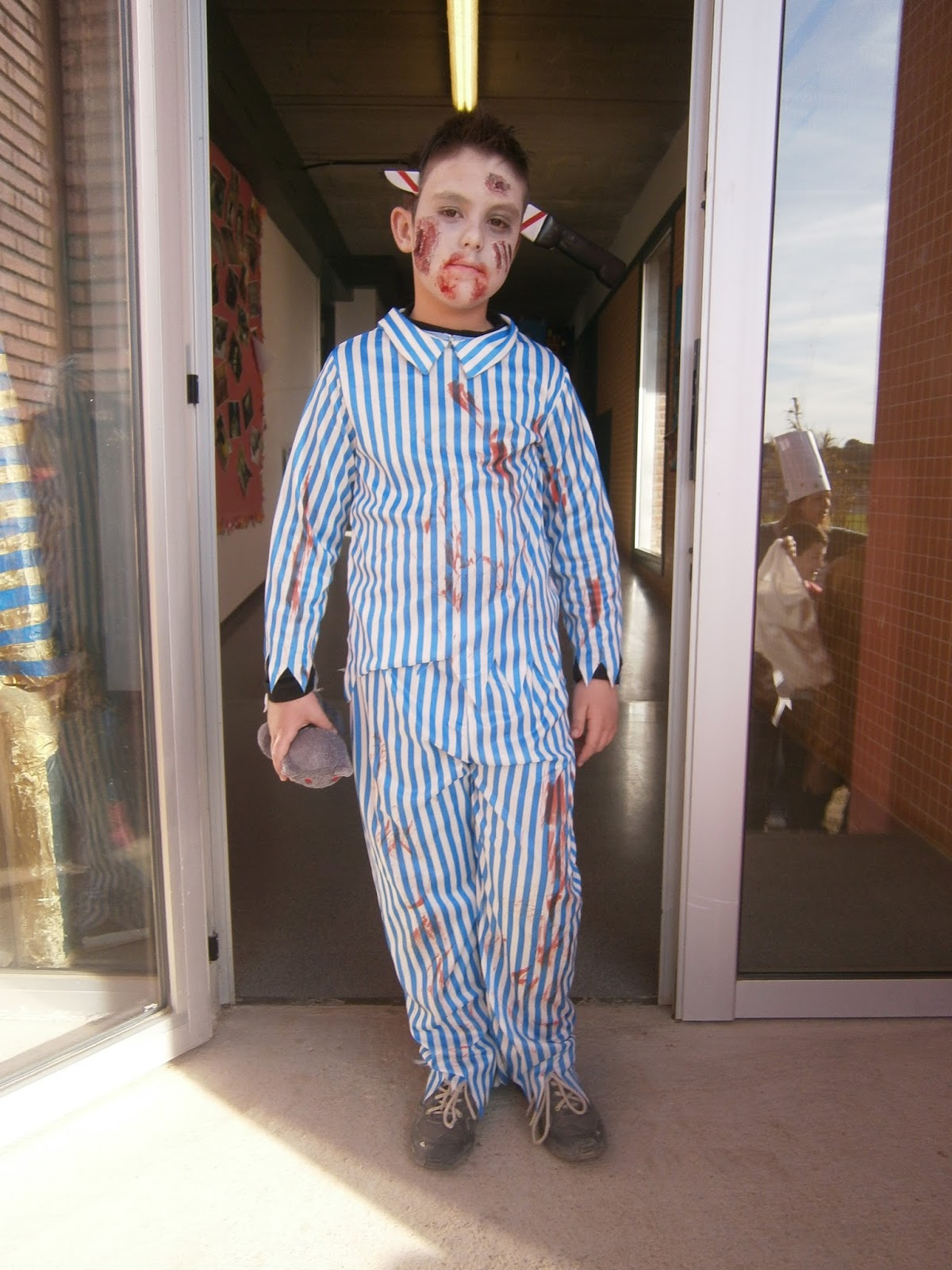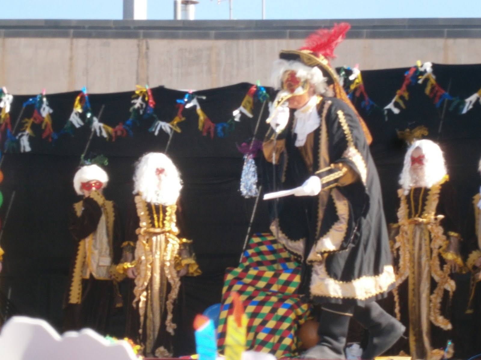Avui a la escola ha vingut el rei Carnestoltes. Tots els nens i nenes de tots els cursos hem sortit al pati. De sobte ha aparegut el rei Carnestoltes acompanyat per una comparsa de nens i nenes de sisè. Anaven disfressats amb màscares i vestits elegants. Els vestits eren nous d’aquest any i eren molt “xulos”. Van pujar a l’escenari i van fer un pregó on parlaven de tots els cursos. Ballaven a l’escenari i feien gracietes.