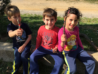També gaudim d’hores lliures, acompanyats dels mestres de l’escola. alguns corren, altres salten a corda, altres agafen flors … també és moment de converses i de riures.