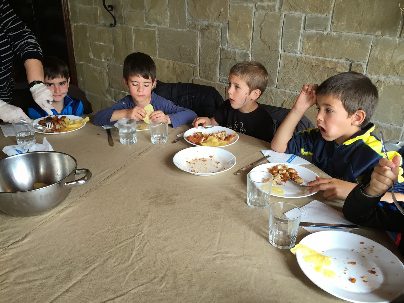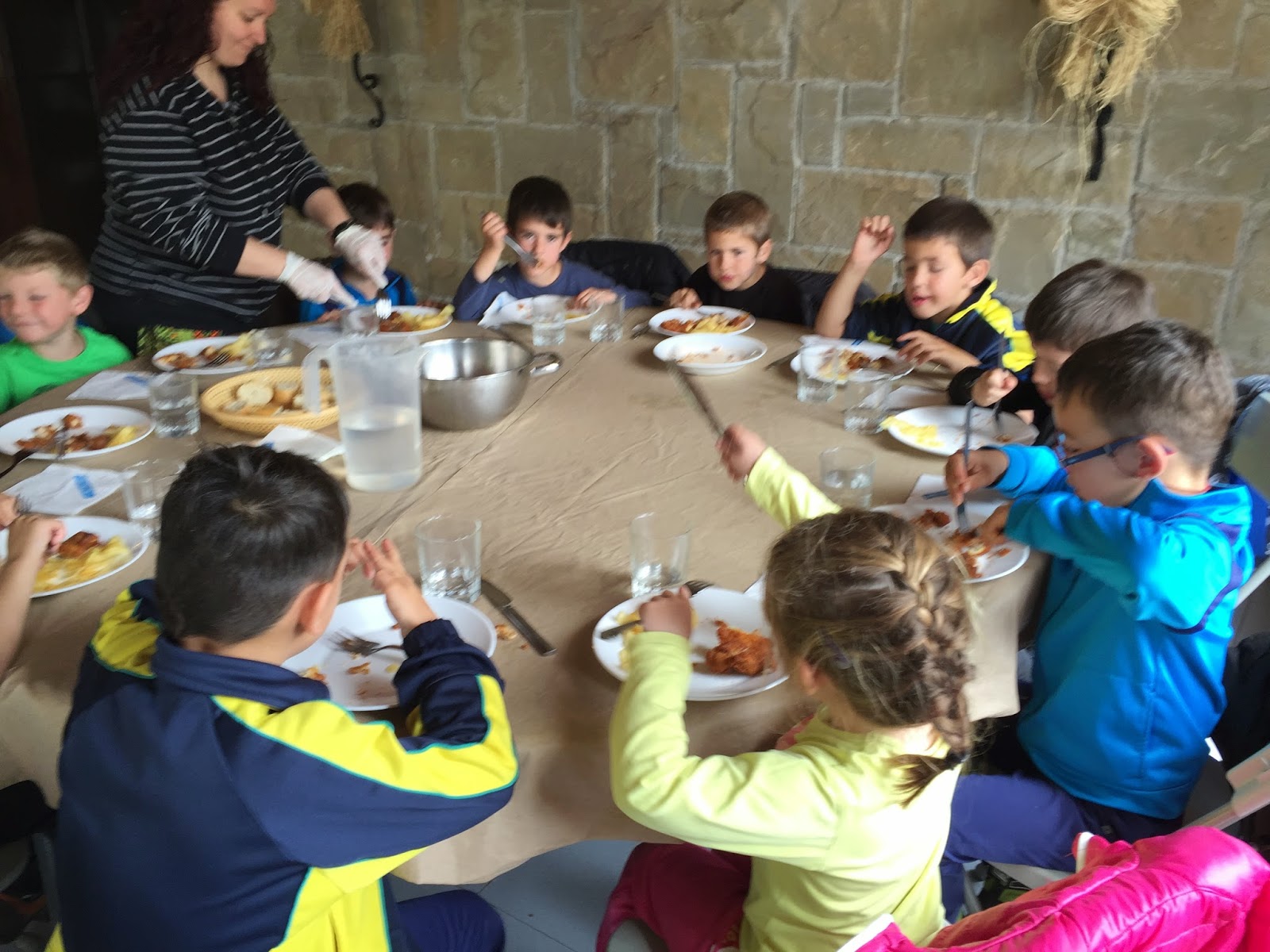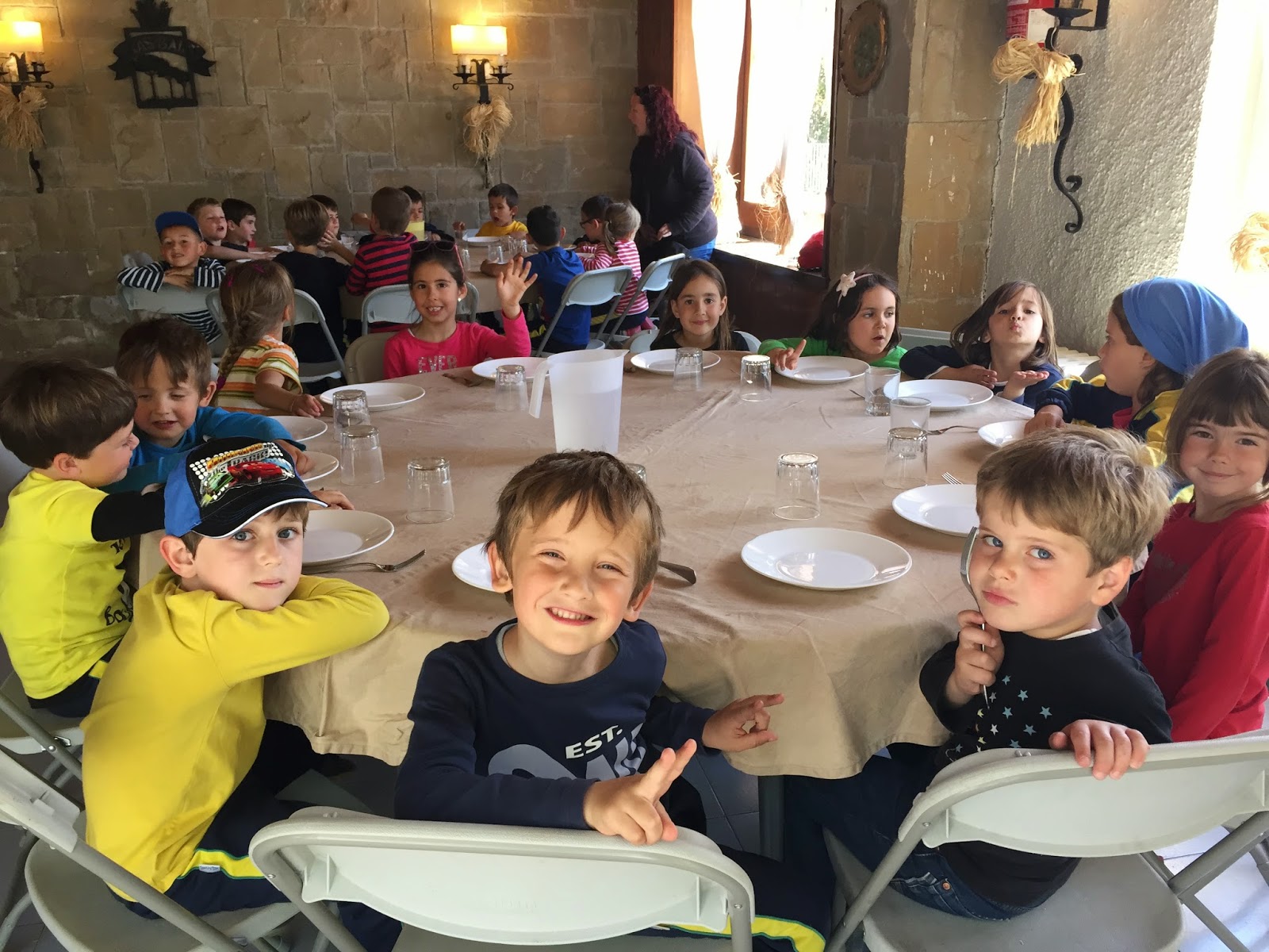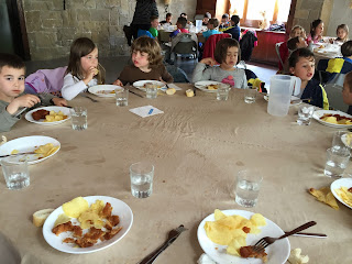 En un prat verd i amb moltes floretes esmorzem i desrpés anem a les habitacions a preparar els llits quina emoció!!.Tot seguit a rentar mans i cap a dinar! mireu quines taules més xules, ja estem a punt per tastar els canalons i els calamars a la romana. També hi han les fotos del dinar de dijous, macarrons i carn rebossada!! mmmmmm boníssim!)