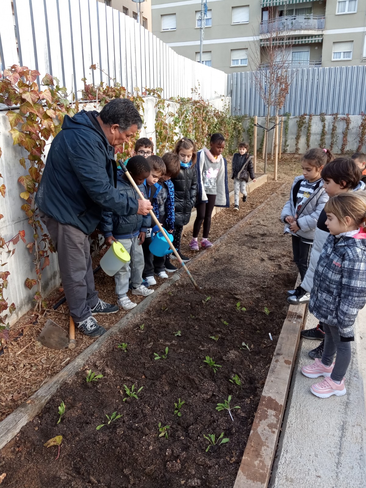 Avui els nens i nenes de 1r i 3r hem fet la primera plantada a l’hort. Ens ha ajudat l’avi Manolo que en sap molt. Els nens i nenes de 1r han plantat faves, enciams de la varietat “fulla de roure” i bledes. I els nens i nenes de 3r han plantat pèsols, cebes i enciams de la varietat “maravilla”. Ara caldrà cuidar-les fins que donin els seus fruits.