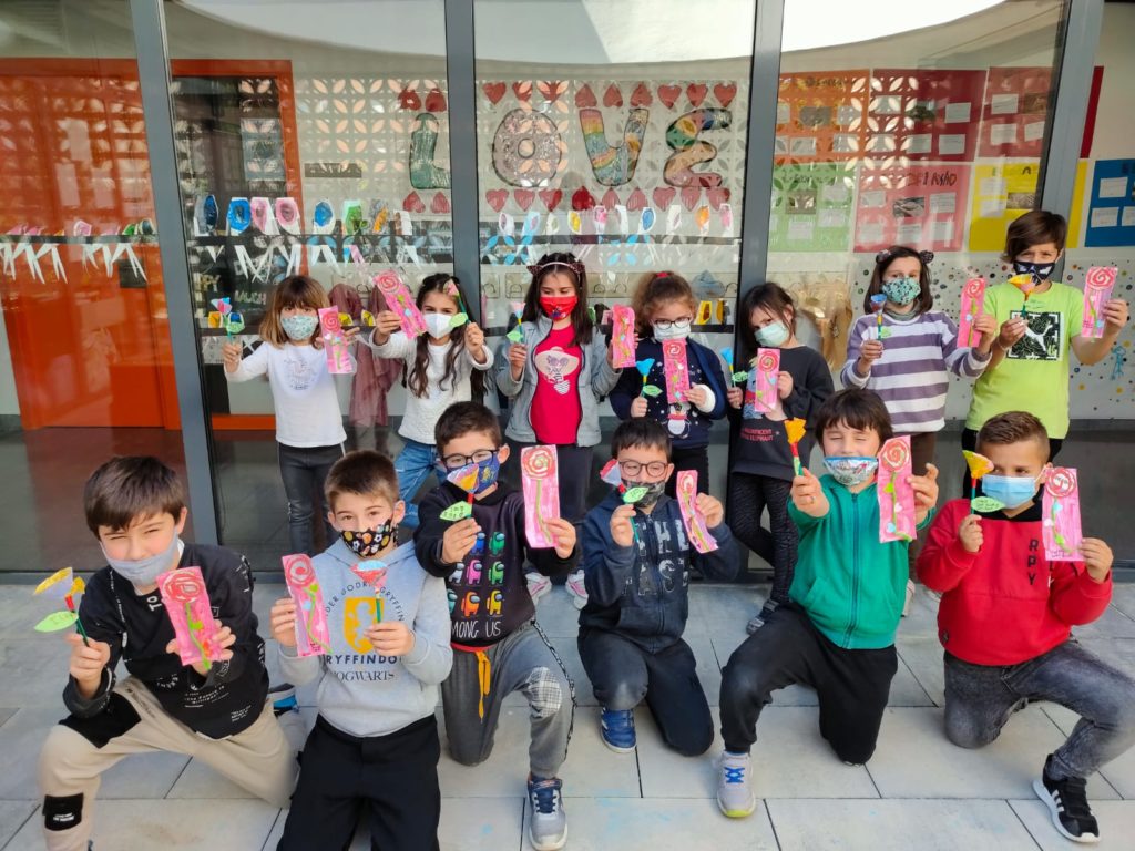 Els dies abans de Sant Jordi i aquell dia, el 23 d’abril. Els alumnes de 1r i 2n van fer un punt de llibre (fent servir paper de diari, llana…) i una rosa (fent servir un llapis verd i una blonda de magdalenes).