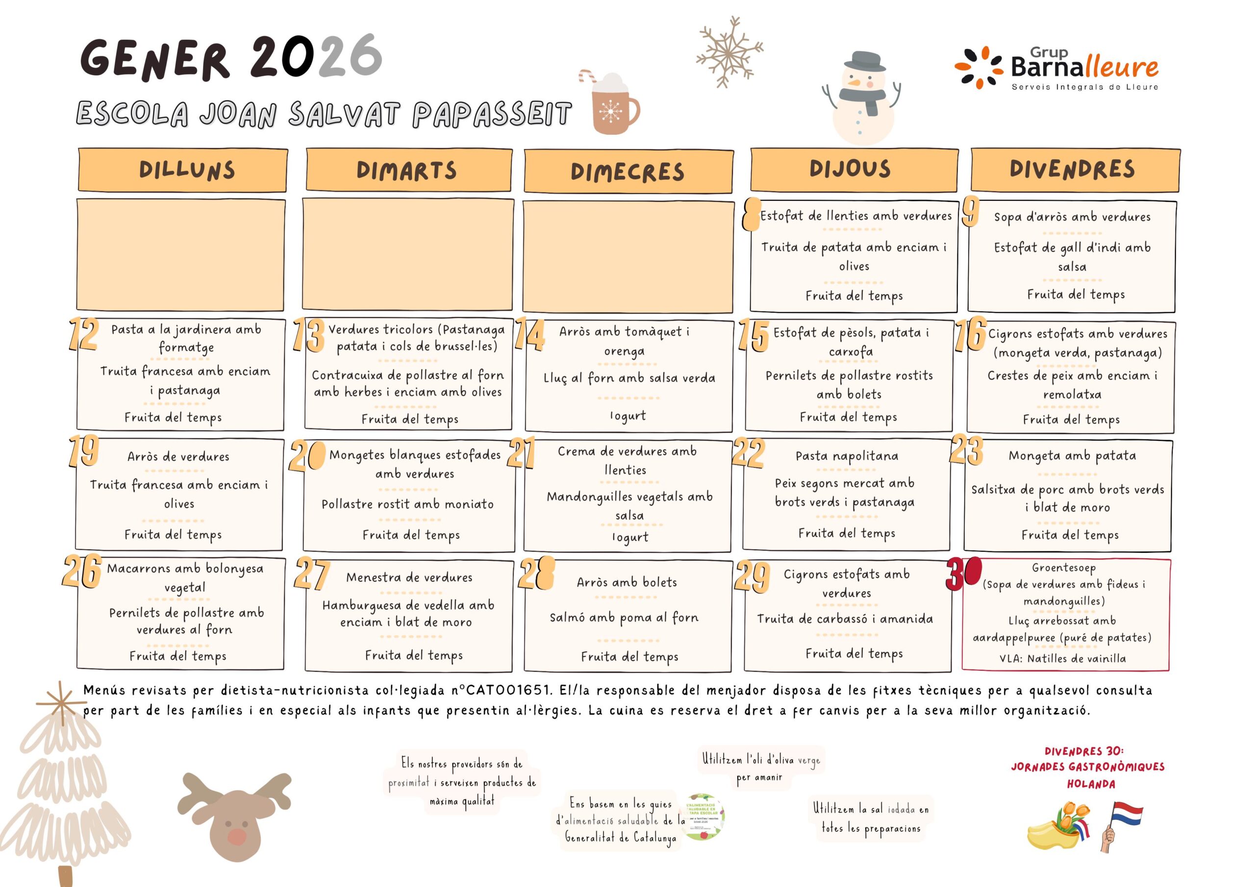 A continuació trobareu el menú escolar de gener i alguns consells sobre alimentació saludable que podeu descarregar: