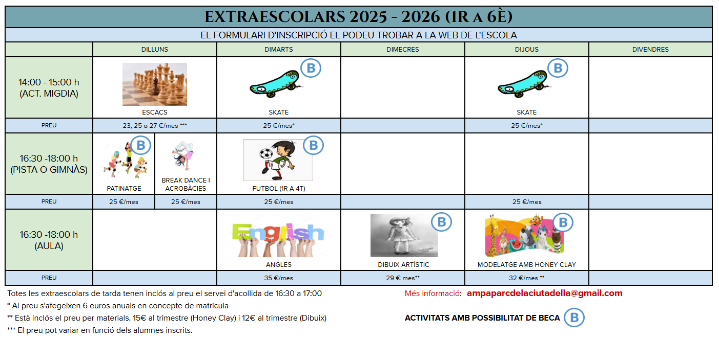 A continuació podeu consultar la imatge amb els horaris, dies i preus de cada activitat, per organitzar millor la participació dels infants.