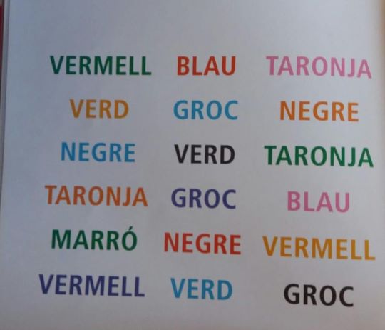 Mireu les paraules escrites aquí al damunt i intenteu dir en veu alta i molt ràpid el color en què estan escrites,