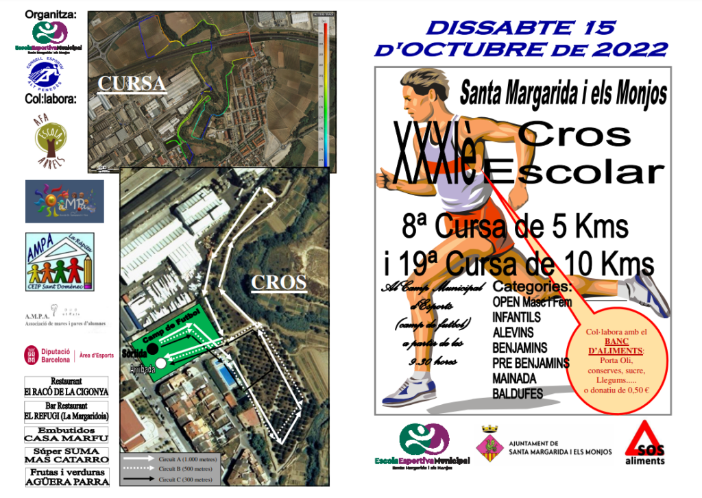 Benvolguts/des, Us fem arribar informació del 1r CROS puntuable d’aquest curs 2022/23 que es celebrarà el proper dissabte 15 d’OCTUBRE a partir de les 11:00h en el municipi de Santa Margarida i els Monjos. I abans, a partir de les 9:30h, es portarà a terme les curses de 5km i 10 km. D’altra banda, us informem de