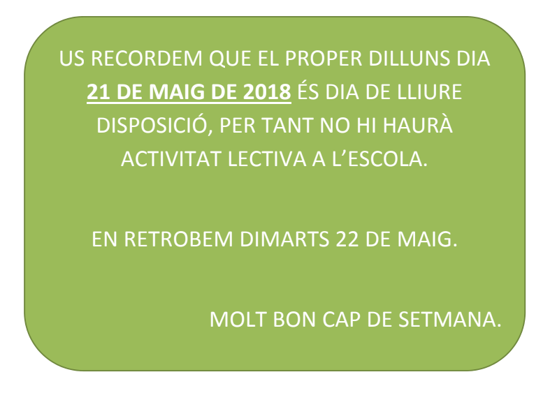 21 de maig dia de lliure disposició Feu un comentari / Per 08034126 / 18 de maig de 2018 / Grans Mitjans Petits Portada / Informacions