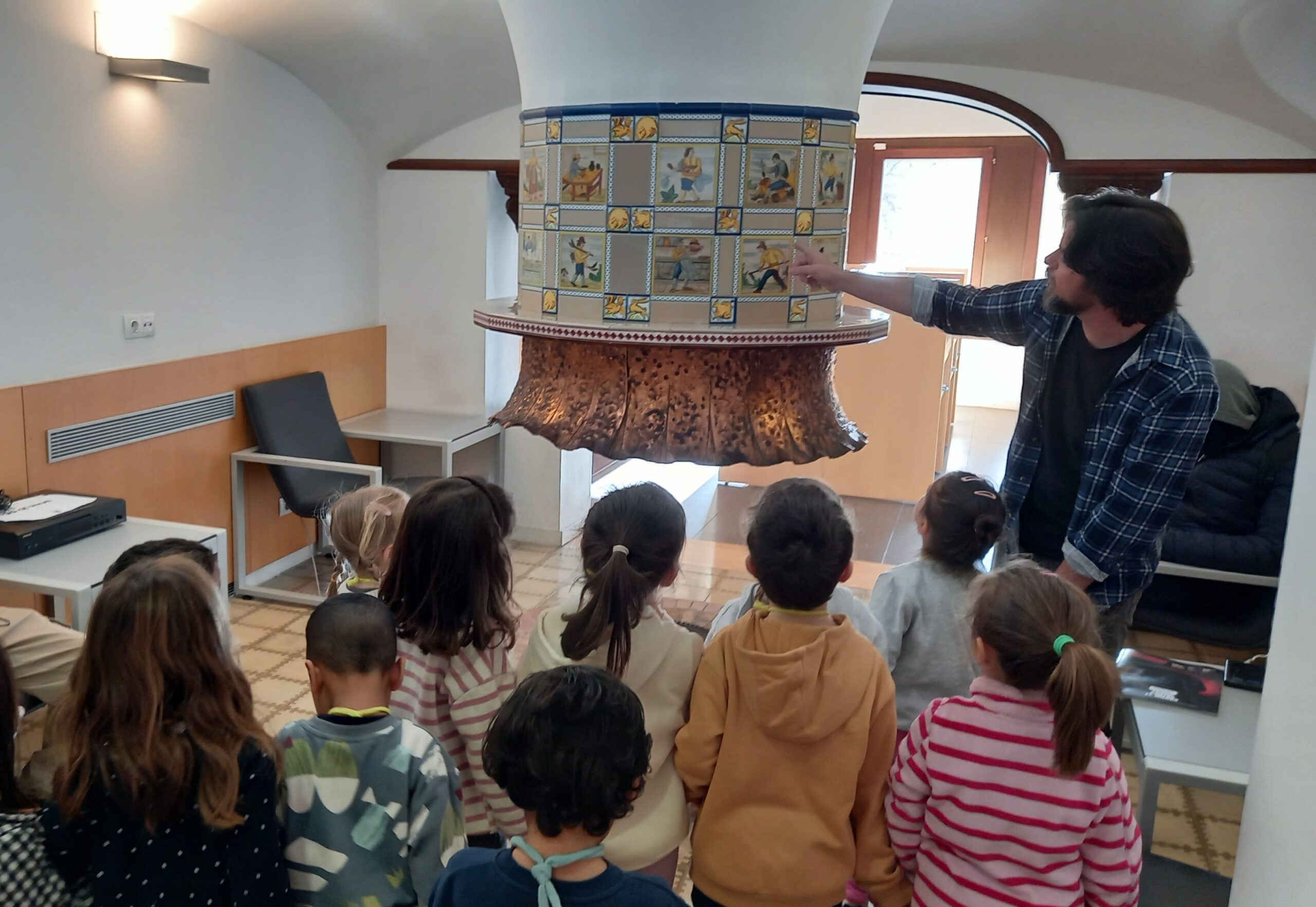 La classe de les Xemeneies ha visitat la biblioteca del barri. Durant la visita, hem descobert que antigament havia estat una masia i hem pogut observar la xemeneia que es conserva a l’interior, decorada amb rajoles que representen diferents oficis.
