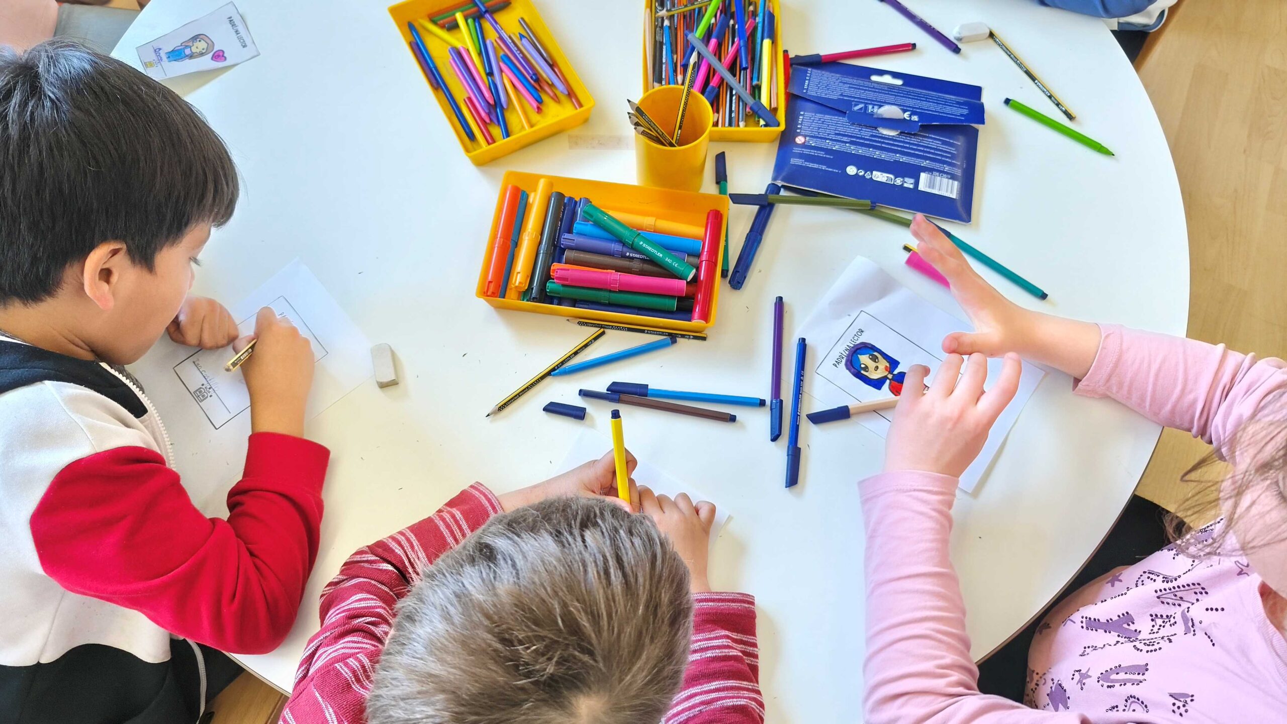 Els infants d’I5 i de 5è ja han fet la segona trobada de padrins i padrines lectors, en la qual han pogut conèixer la seva parella lectora i començar a compartir estones de lectura. Per identificar-se, han elaborat uns cartells amb el seu nom que després han intercanviat amb la seva parella.