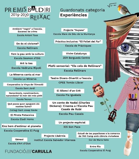 Ens complau compartir amb vosaltres la nostra alegria i emoció en rebre el Premi Baldiri Reixac 2019-20 (Fundació Carulla) en la categoria d’Experiències. Aquests premis reconeixen i impulsen projectes que, mitjançant la cultura i els llenguatges artístics, transformen l’educació.