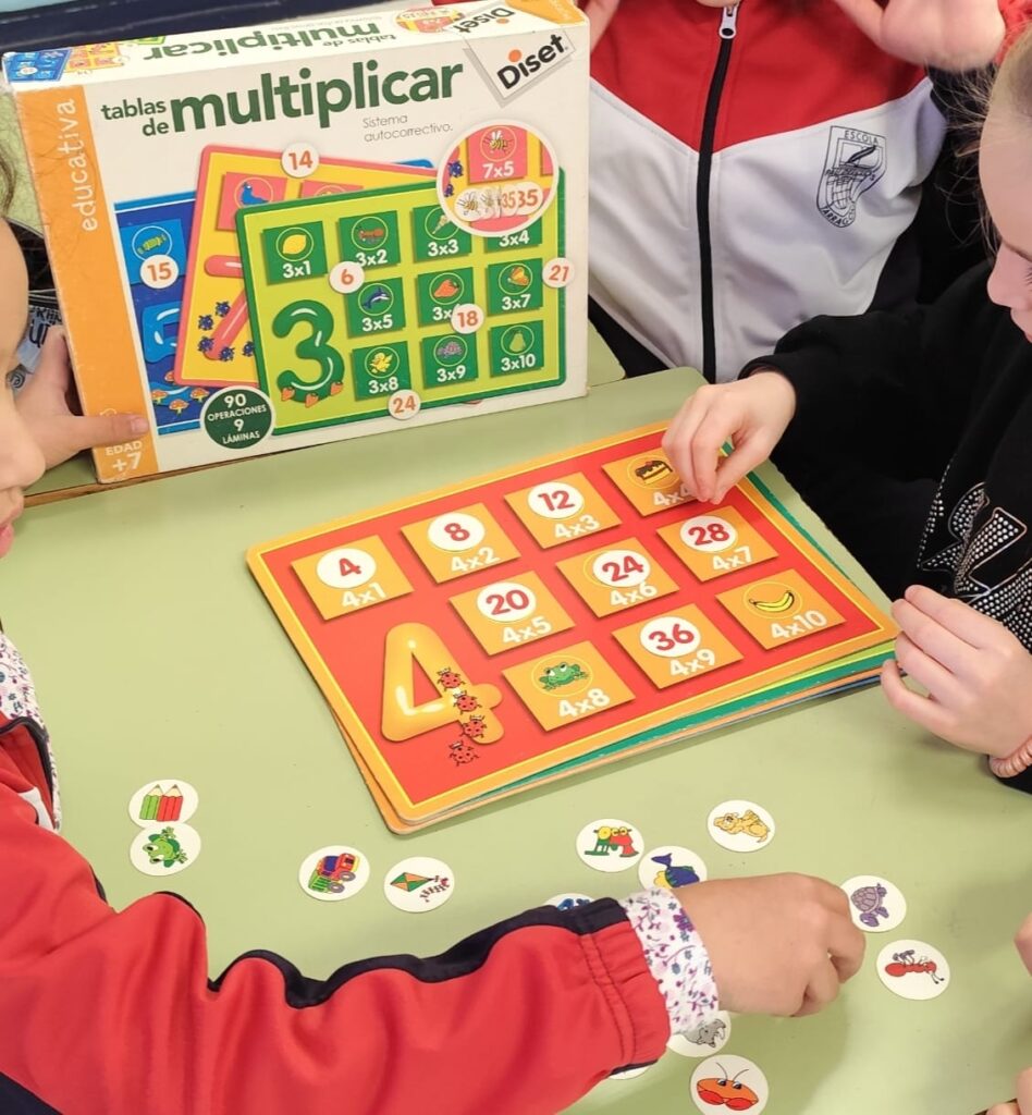 L’alumnat de 3r estem repassant les taules de multiplicar de manera variada i engrescadora. Les practiquem amb materials manipulatius, diferents aplicacions digitals i un joc cooperatiu en què els infants es fan preguntes entre ells i elles i poden autocorregir-se. De tant en tant, dediquem una estona de matemàtiques a reforçar-les i consolidar-les. D’aquesta manera,