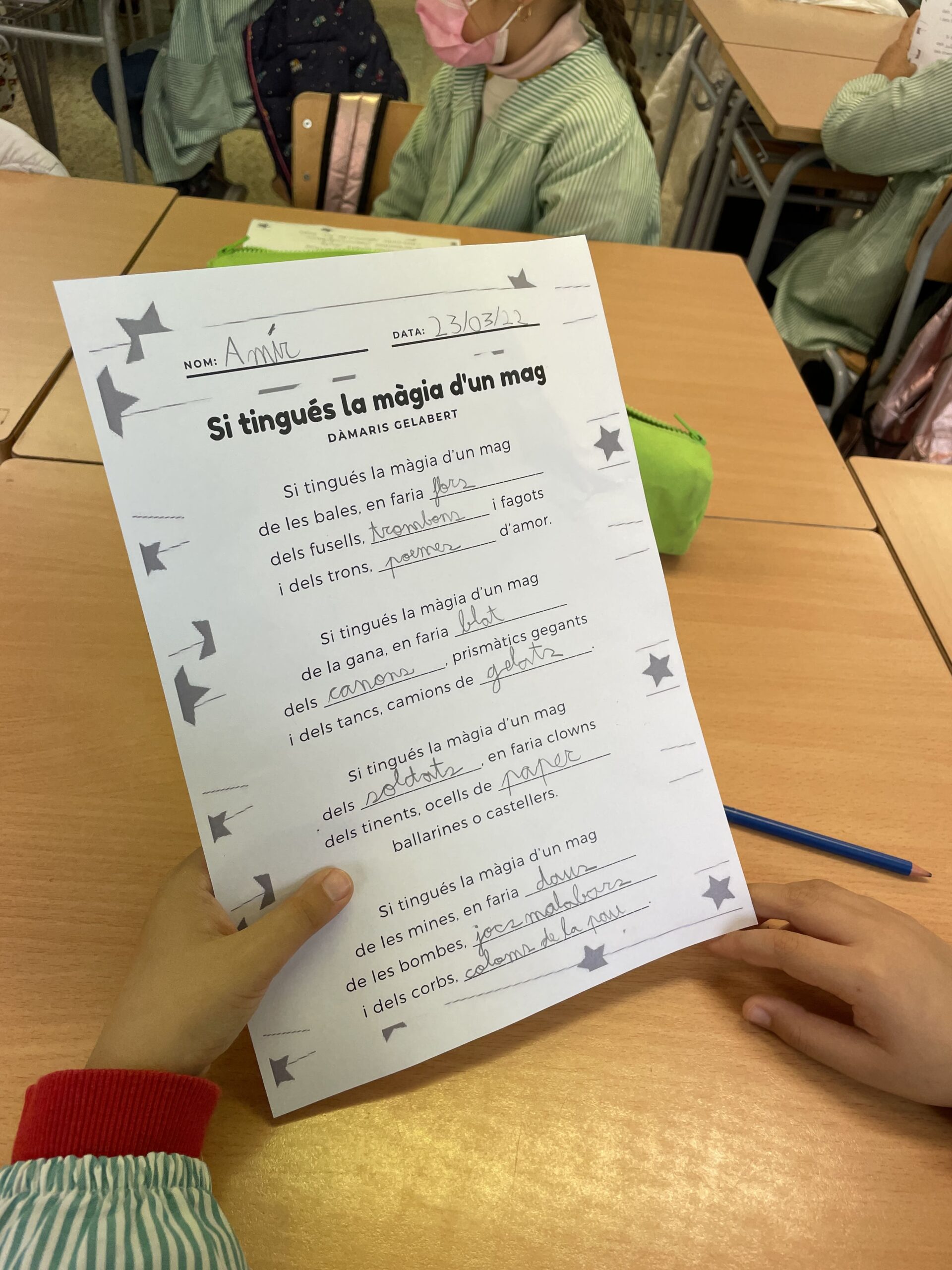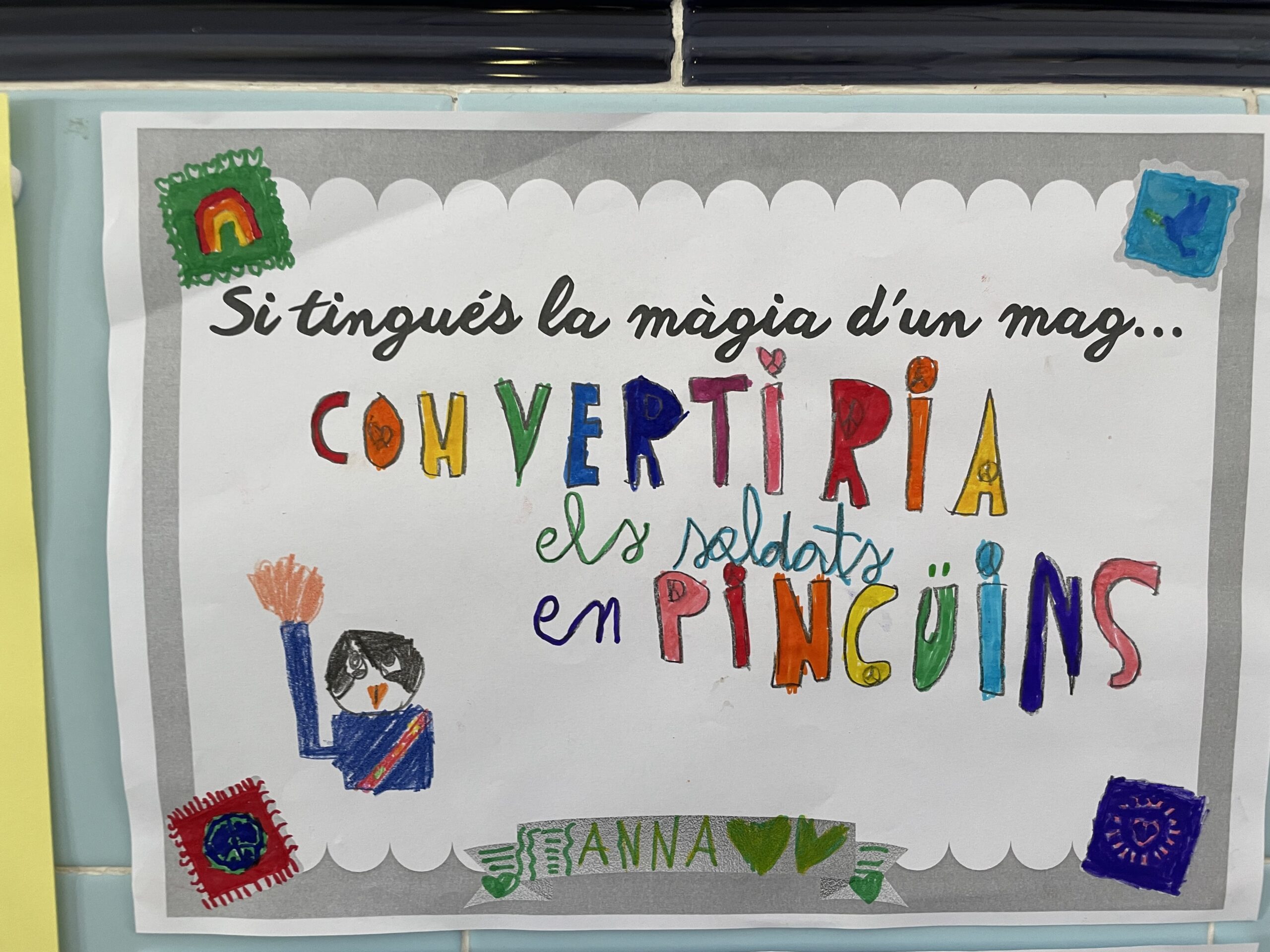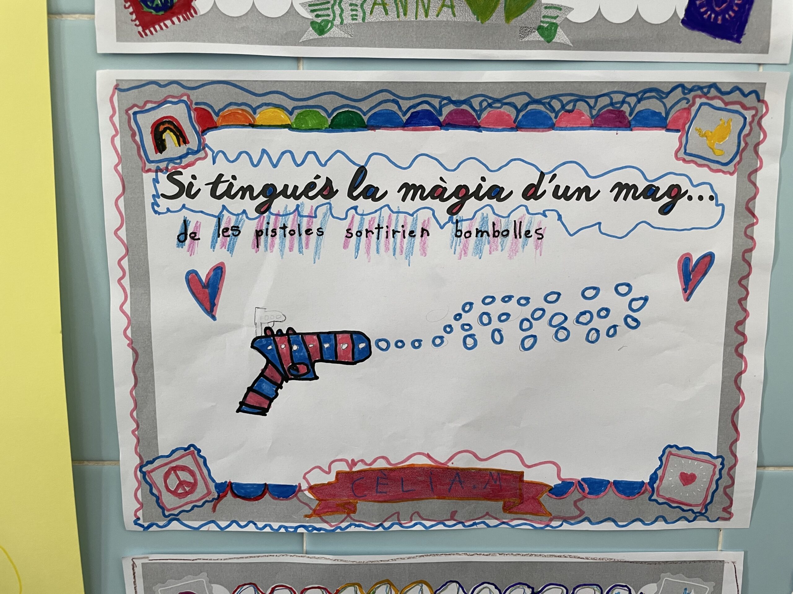 També ens hem posat a la pell d’un mag i seguint l’esquema de la cançó hem pensat idees que faríem per acabar amb la guerra i transformar els diferents elements si tinguéssim la màgia d’un mag. Han sortit propostes molt boniques!