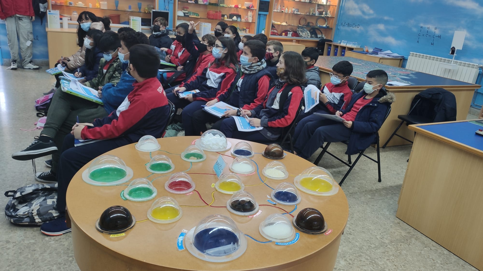 Primer, ens han fet una sèrie de preguntes sobre el petroli per tal de saber el nostre nivell de coneixement de la indústria petroquímica: Per a què serveix? On el trobem? Què és? Com s’ha format?… A continuació ens han explicat com es forma el petroli i ens han comentat que a 51km trobem Casablanca, la plataforma petrolífera de Tarragona. Tots junts hem anat completant les imatges on es representava tot el procés, des de la substracció fins el seu tractament i els usos que se’n deriven.