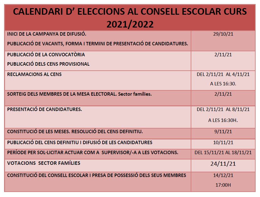 A la nostra pàgina web us anirem penjant informacions relacionades amb el procés de renovació d’alguns membres del Consell Escolar.