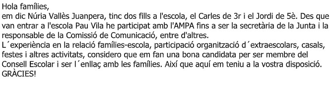 Us presentem les candidatures per a les eleccions al Consell Escolar. Gràcies candidates per la vostra predisposició i col.laboració!!