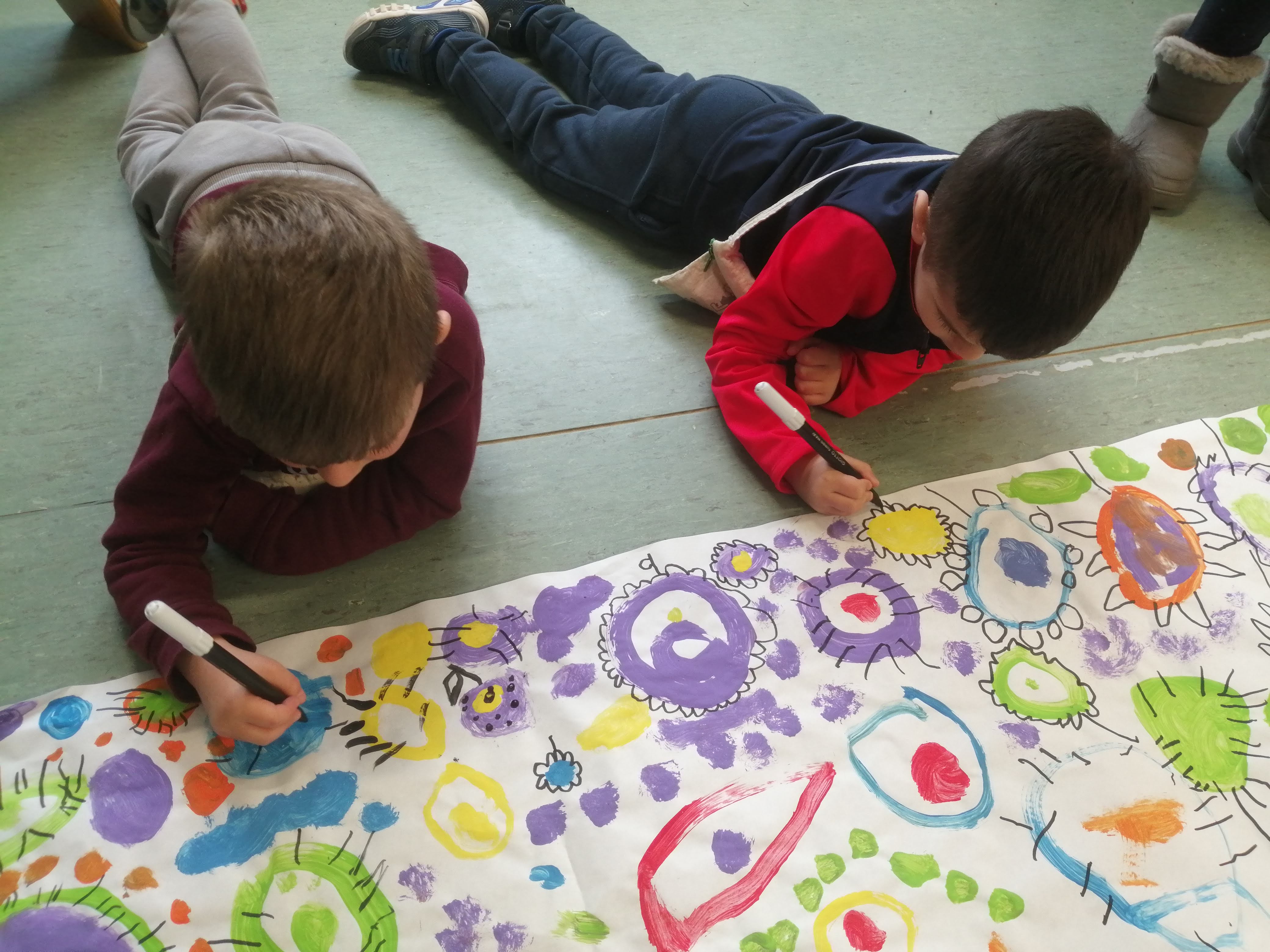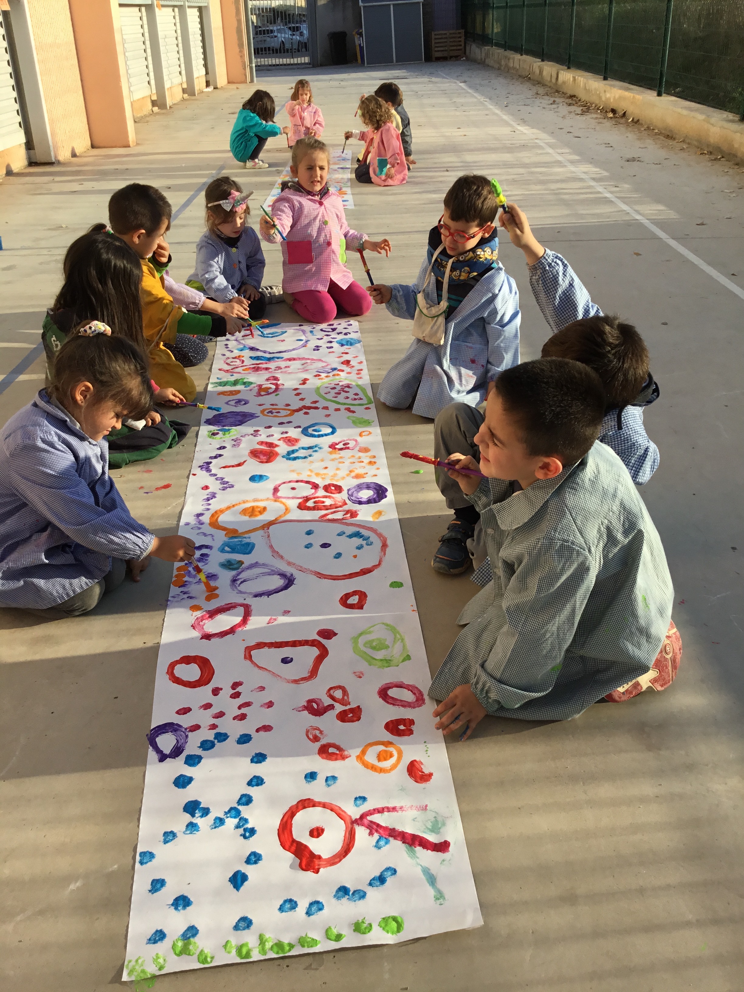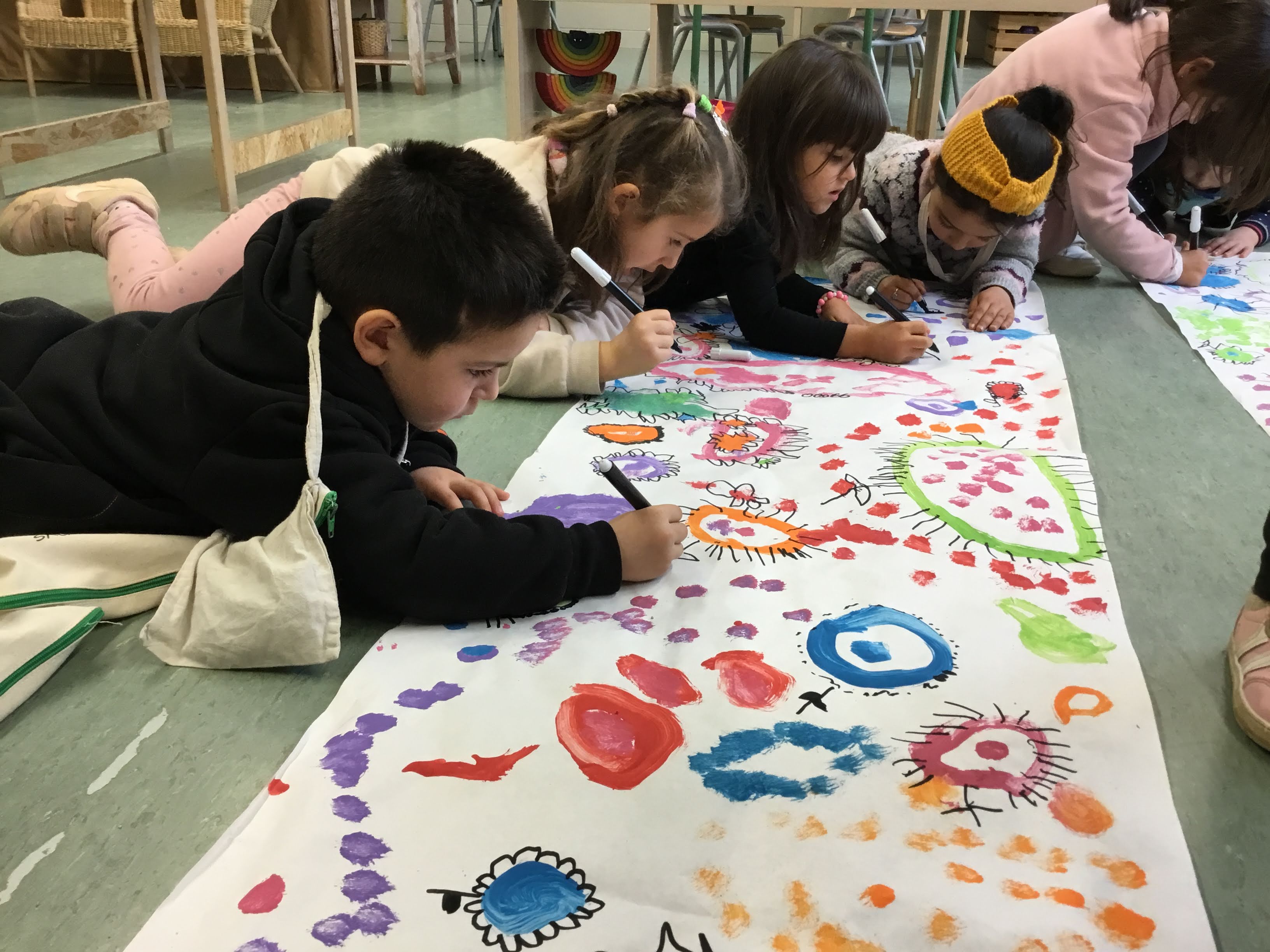 CAMP DE FLORS: SOBRE UN PAPER GRAN I PINTURA DIBUIXEM ELS TRAÇOS QUE LA MESTRA ENS VA INDICANT: UN CERCLE GRAN, DOS CERCLES PETITS, UN CERCLE GRAN AMB UN CERCLE PETIT DINTRE,…COMBINEM EL MOVIMENT DE CANVIAR DE LLOC, L’ÚS DE DIFERENTS COLORS, LA CREACIÓ DE LES FORMES,…