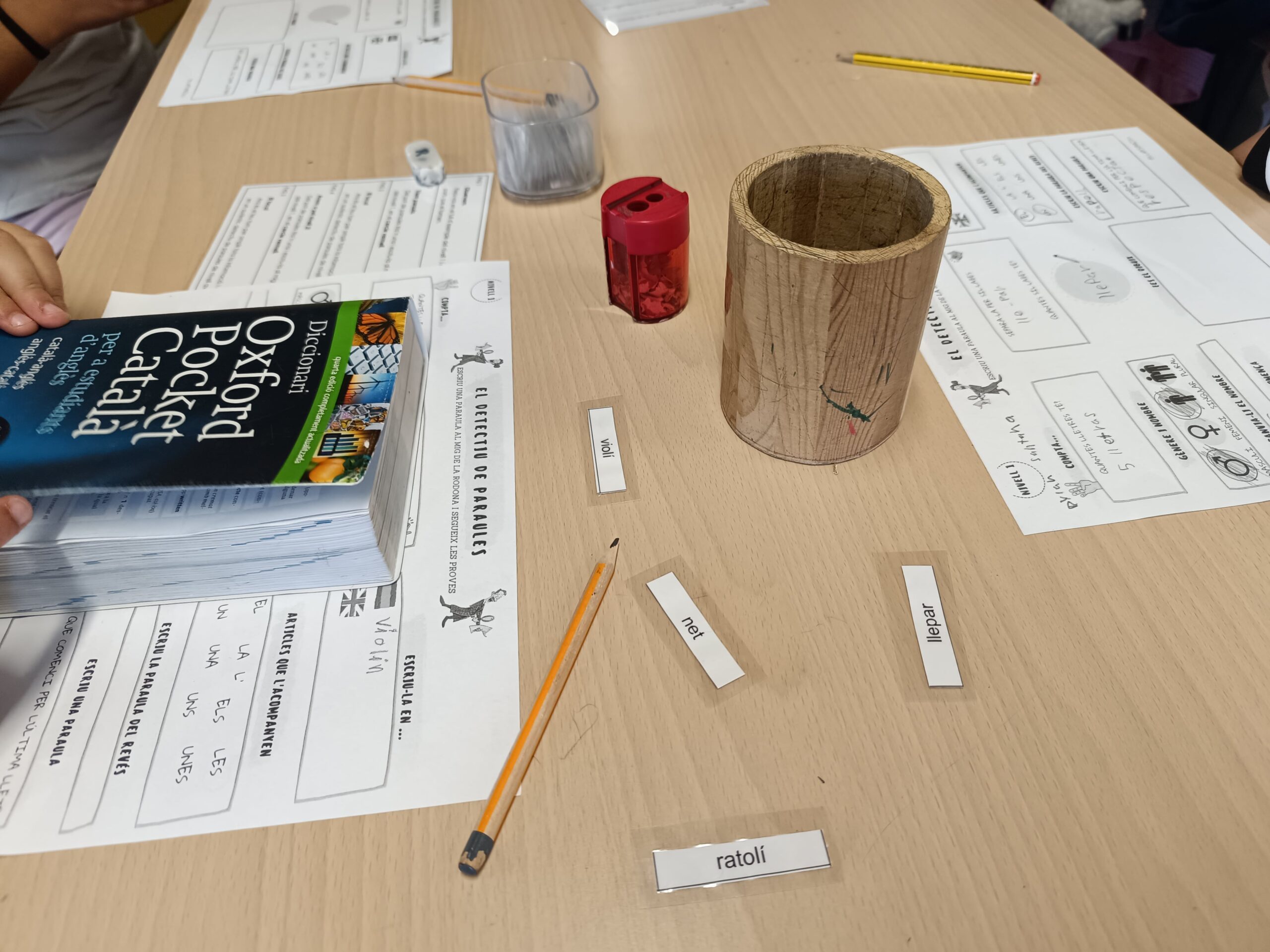 En segon lloc, Detectiu de paraules. En aquest racó, l’atenció i la llengua s’entrellacen. Els infants es converteixen en autèntics detectius, responent a les petites qüestions sobre les diferents tipologies de les paraules.