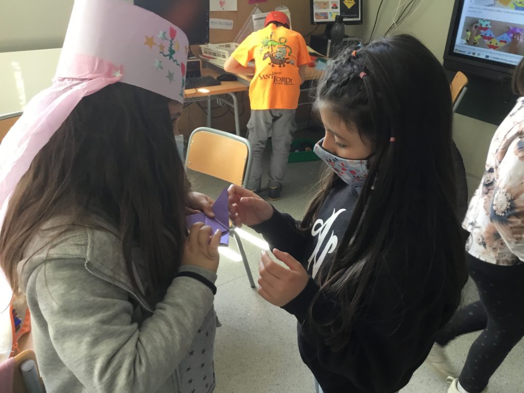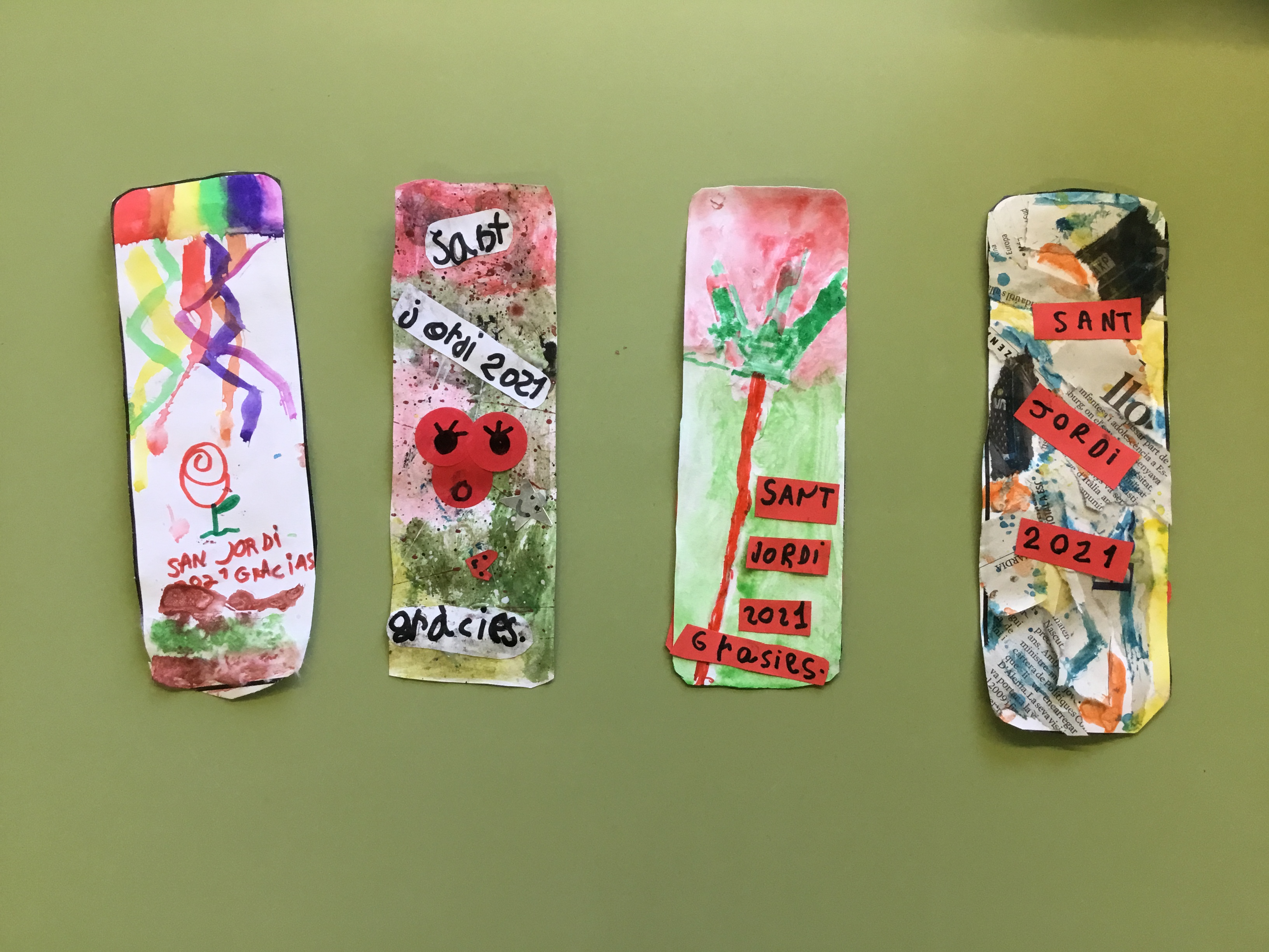 Durant el dia de Sant Jordi també vam realitzar uns tallers molt divertits i entretinguts. Cadascú anava triant el taller per on volia começar. Es podia escollir entre: un punt de llibre divertit, un sudoku de Sant Jordi, una rosa-imperdible i/o un drac “come-cocos”.