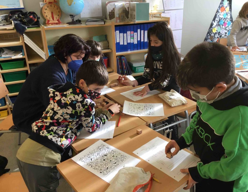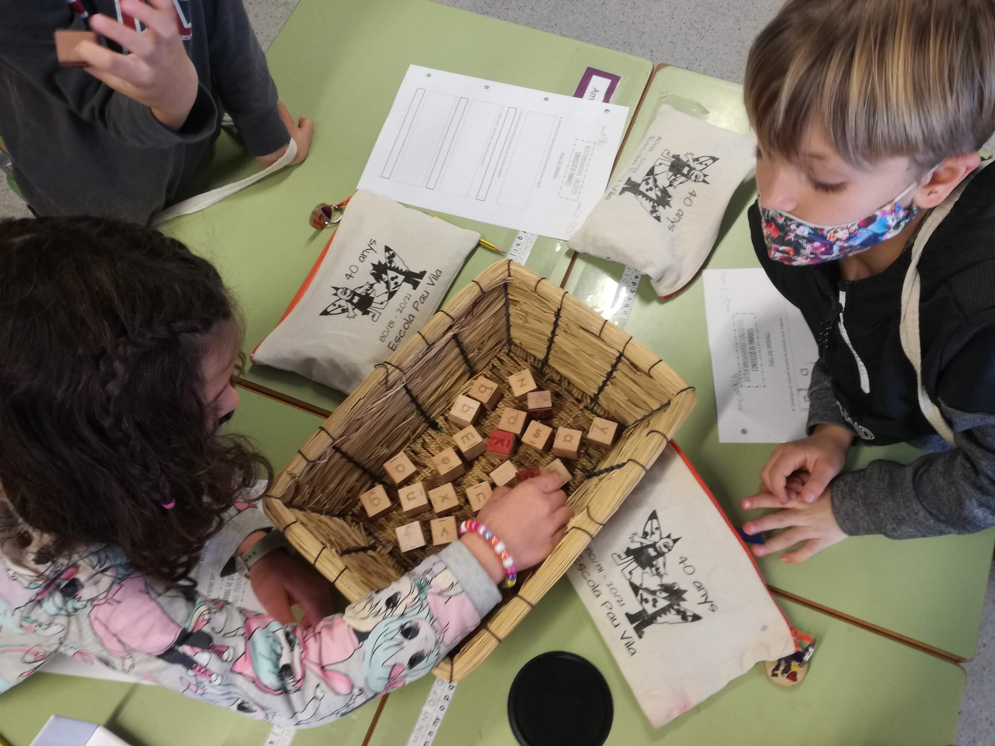 4- ESTAMPEM PARAULES. En aquest racó, hem volgut tractar la lletra d’impremta. Els alumnes havien de confegir paraules amb els segells d’estampació i tot seguit escriure una frase sobre aquella paraula escollida.