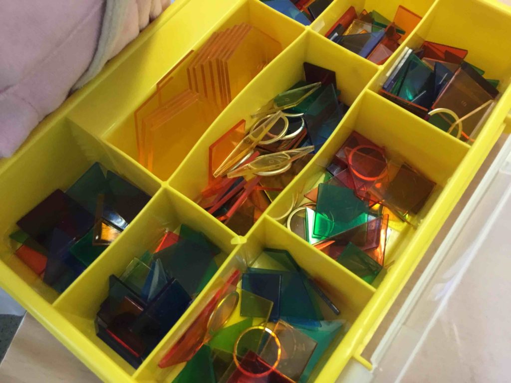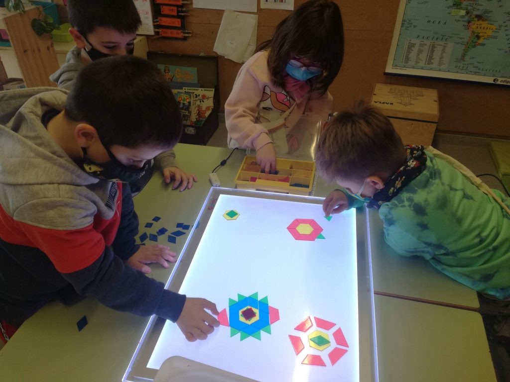 1- FEM MANDALES. Per tal de potenciar la part creativa dels infants, hem proposat un nou racó on podien experimentar i manipular amb peces de diferents formes geomètriques i colors, creant mandales (seguint un patró) a la taula de llum. Tot seguit, havien de reproduir el mandala a un full.