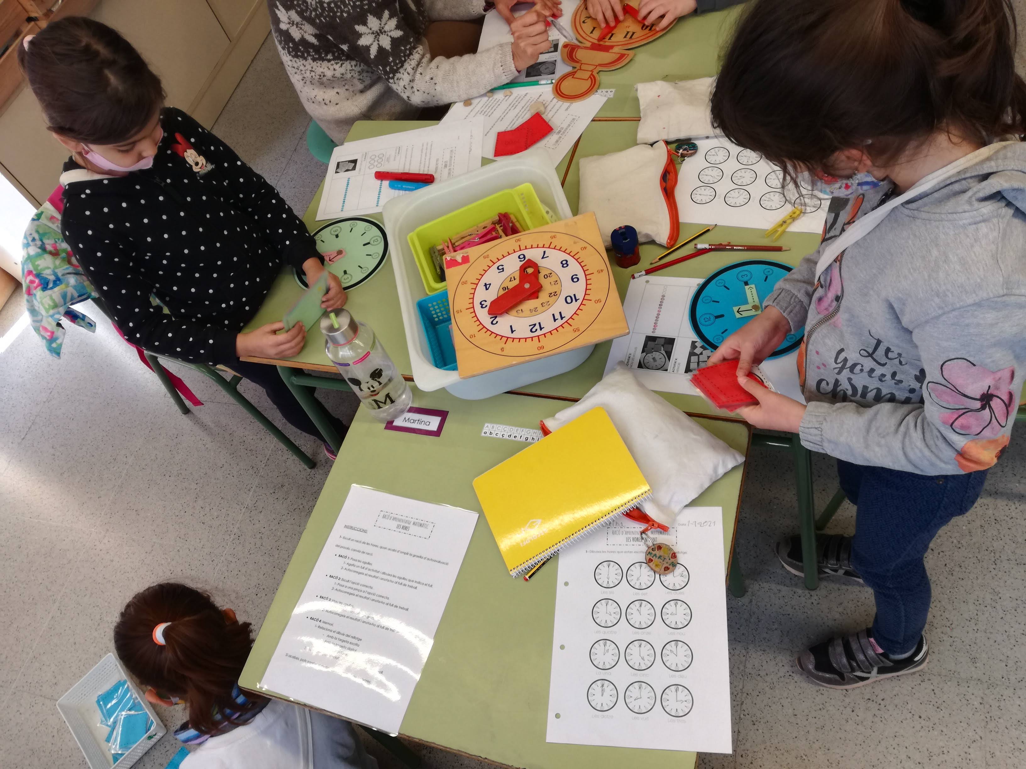 2- LES HORES. A partir de diferents propostes manipulatives, hem après les hores en punt (a.m i p.m.). Les i els alumnes tenien al seu abast rellotges de fusta, targetes amb les hores de forma digital i analògica, la llibreta personal (per revisar i corregir el què anaven fent), i un full de treball.