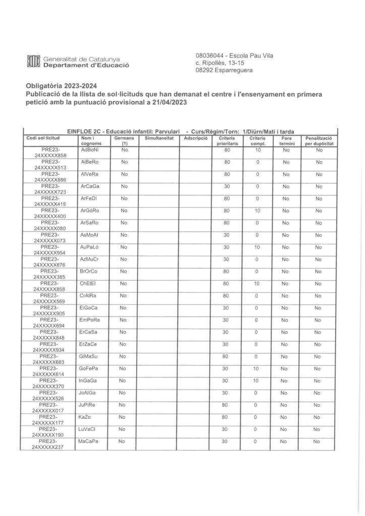 Llista de sol·licituds que han demanat el centre i l’ensenyament en primera petició amb la puntuació provisional Susana Murciano21/04/23 Benvolgudes famílies, A continuació podeu consultar el llistat de les sol·licituds que hem rebut al centre amb la puntuació provisonal