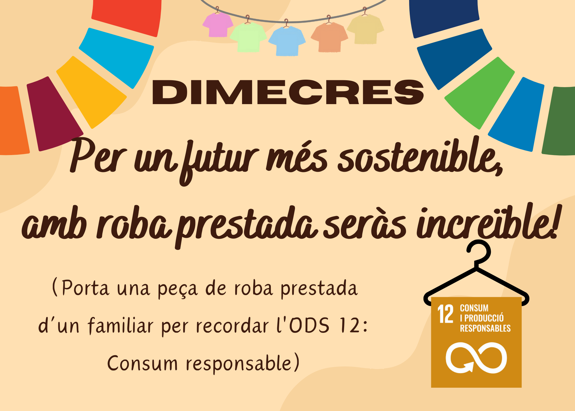 Aquest dimecres, per recordar l’ODS 12: Consum responsable, tothom haurà de portar una peça de roba prestada d’un familiar. Una camisa del pare, un jersei de l’àvia, una bufanda del germà… qualsevol peça que ens recordi que reutilitzar és una manera genial de cuidar el planeta!