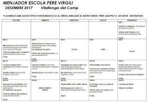 MENÚ DESEMBRE admin18/12/17 MENÚ DESEMBRE La setmana del 18 al 22 ha estat modificada, podeu consultar el menú a la cartellera de l’escola. Gràcies