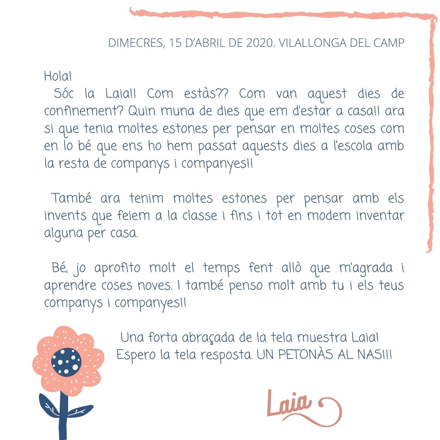 Hola Laia soc l’Adam, a casa estem tots bé espero que vosaltres tambè, trobo a faltar als profes i companys i espero que ens veiem aviat.