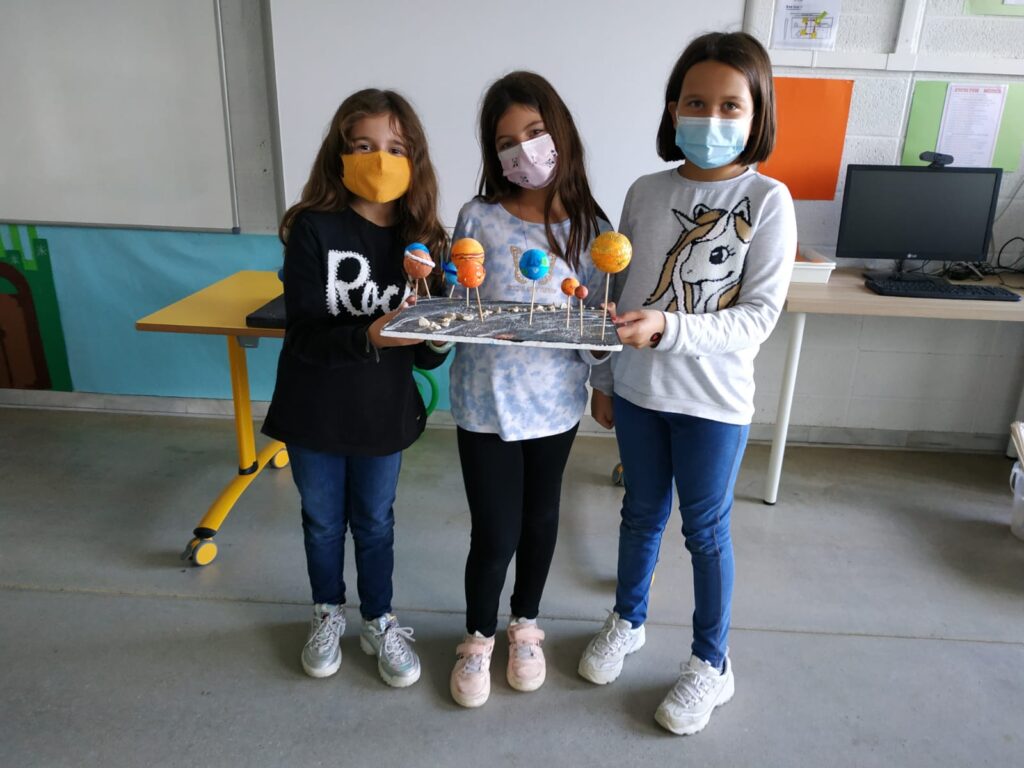 Aquest trimestre els i les alumnes de 4t estem treballant el Sistema Solar. Estem investigant els diferents planetes que hi ha i altres cossos celestes que s’hi poden trobar. També ens interessa molt la relació entre la Terra i la Lluna i per què tenim les estacions de l’any o la nit i el dia.