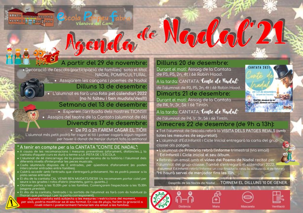 Ja s’acosta la Festa de Nadal a l’escola i aquests dies comencem les activitats nadalenques al centre. Aquí teniu l’AGENDA DE NADAL 2021: