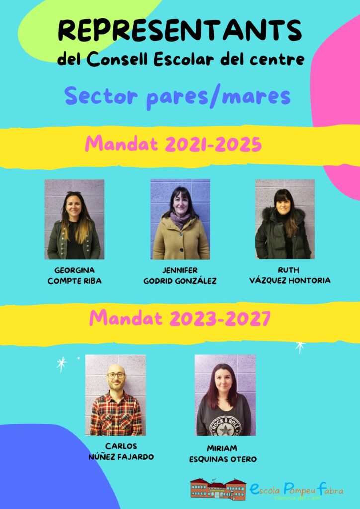 RESULTATS ELECCIONS CONSELL ESCOLAR Benvolgudes famílies, Després de les votacions de les eleccions al Consell Escolar del centre, els/les representants del sector pares/mares són: De les darreres eleccions 2021 (mandat 2021-2025): Georgina Compte (mare de 5è) Jennifer Godrid (mare de 5è) Ruth Vázquez (mare de 4t) De les eleccions d’aquest curs (mandat 2023-2027): Carlos Núñez