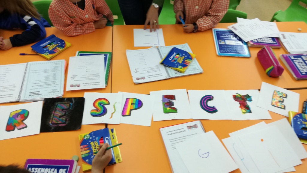 Amb l’objectiu de crear un mural pel vestíbul de l’escola relacionat amb l’eix transversal del centre per aquest curs: Des del RESPECTE, tot és possible!, hem creat un acròstic amb la paraula respecte, escollint les paraules que més ens han agradat de totes aquelles que portaven proposades dels seus grups-classes. Posteriorment hem escrit les lletres a les seves caselles i properament el penjarem al vestíbul de l’escola.