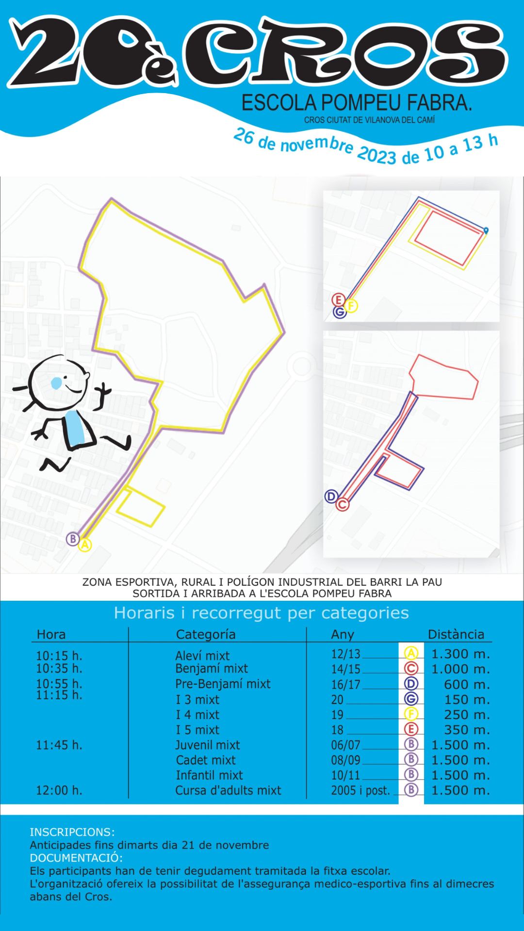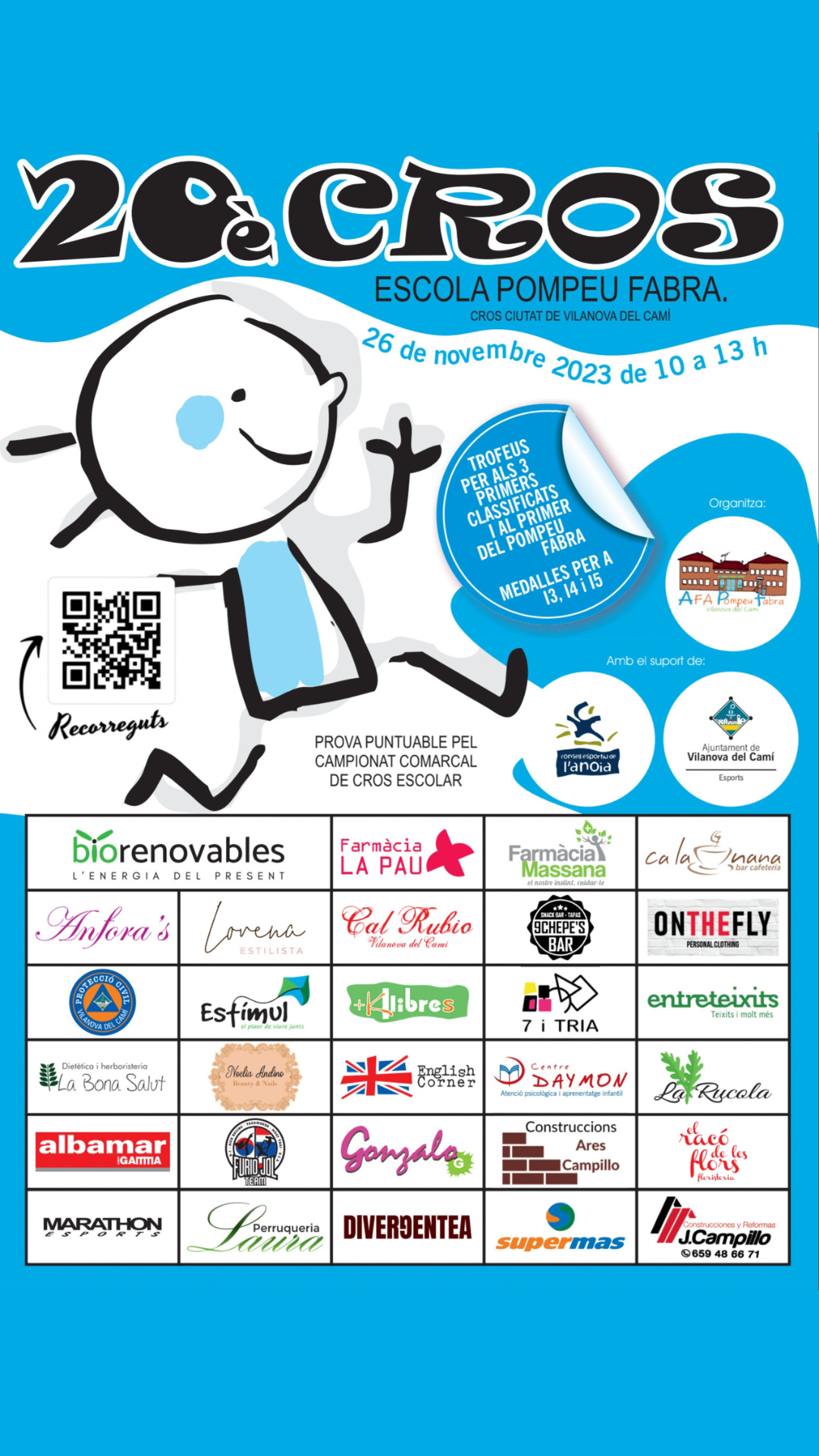 26è CROS POMPEU FABRA!!!! Feu un comentari / Per admin / 16 de novembre de 2023 / AFA AMPA General Infantil Portada Primària El proper DIUMENGE 26 DE NOVEMBRE de 10h a 13h es durà a terme el 26è CROS POMPEU FABRA i l’AFA ja ho té tot a punt perquè sigui una jornada ben lluïda. No hi podeu faltar!!!