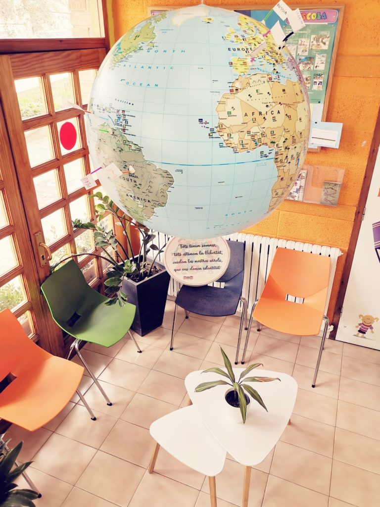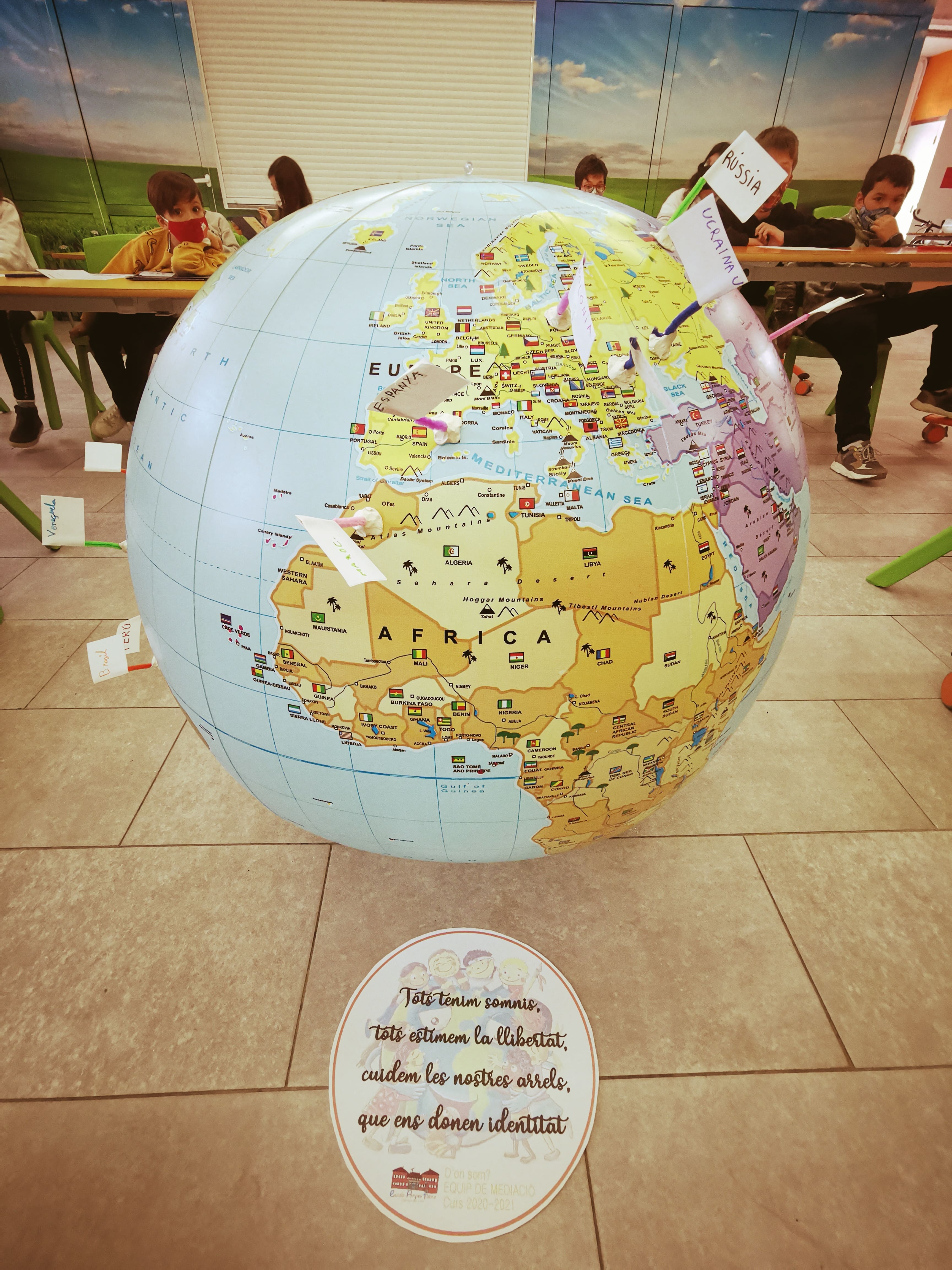 En aquesta ocasió, hem aprofitat la trobada per treballar la interculturalitat i multiculturalitat a l’escola. Cada mediador/a ha identificat les diferents nacionalitats dels companys/es de classe. Cadascuna de les nacionalitats del centre, les hem identificat en un globus terraqui gegant i hem col.locat unes banderetes a cada país d’on prové l’alumnat. Amb aquesta tasca hem valorat la importància de reflexionar sobre que tots i totes som diferents (procedència, físicament…) però som iguals i necessitem un mateix tracte i respecte. Amb el globus terraqui hem afegit una frase molt interessant: “Tots tenim somnis, tots estimem la llibertat, cuidem les nostres arrels que ens donen identitat!”. Ara aquest globus el podeu trobar al vestíbul de l’escola.