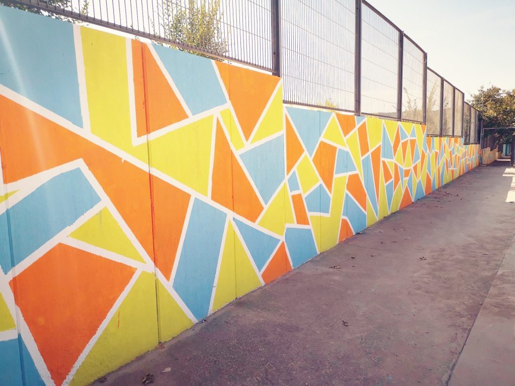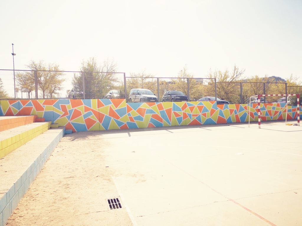 En aquesta ocasió vam decorar la paret principal de la pista poliesportiva del centre. Cada alumne/a ha pintat un petit tros i tots plegats hem aconseguit un lluït producte final.