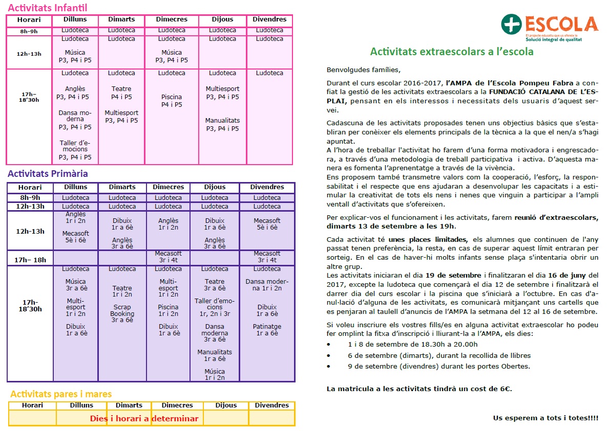 Aquí podeu consultar les activitats per aquest curs: Llibret families extraescolars curs 16-17 Pompeu Fabra