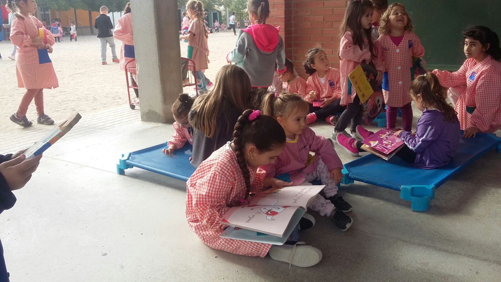 A més, els dijous tenim BIBLIOPATI, tant al pati d’Ed.Infantil com al de Primària, situem una bibliopati perquè l’alumnat pugui escollir un llibre, una revista, un còmic… i llegir durant l’estona d’esbarjo. Un cop l’han llegit, el poden retornar al carro de llibre.