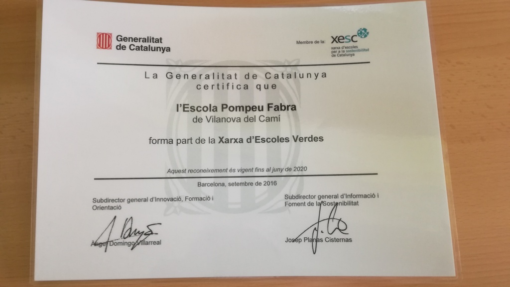 Ahir, l’Ana González com a mestra representant que participa al Seminari d’Escoles Verdes de l’Anoia, va rebre en nom de l’escola la renovació del certificat de la Generalitat de Catalunya on hi consta que el nostre centre forma part de la Xarxa d’Escoles Verdes. Aquest document ens compromet fins el 2020 a continuar amb el treball ecològic i de cura del Medi Ambient que ja portem fent des de la creació de l’Escola Pompeu Fabra i que es fa palès amb les XXVII Jornades Ecològiques que celebrarem aquest curs.
