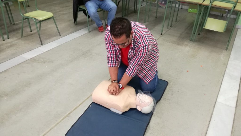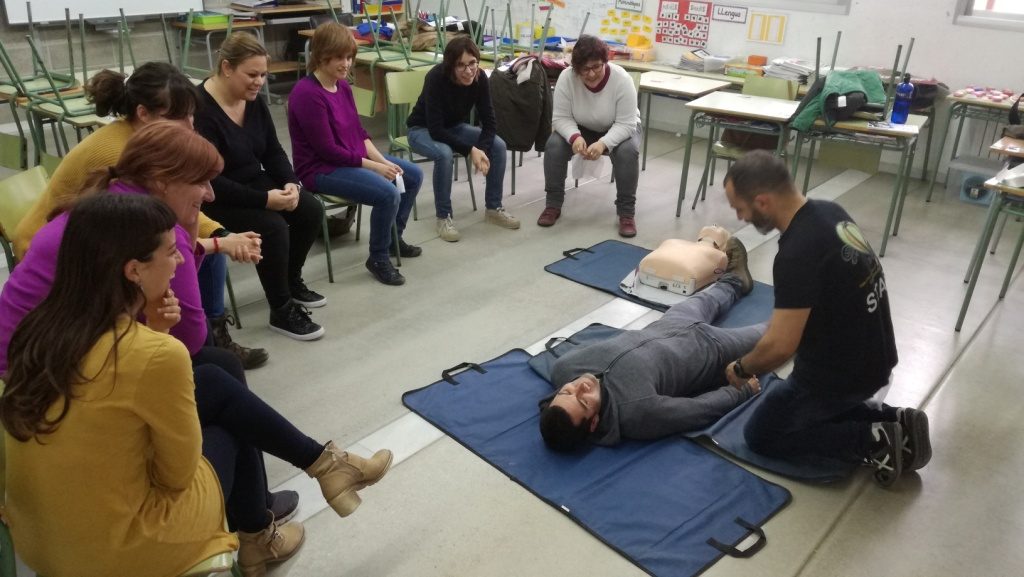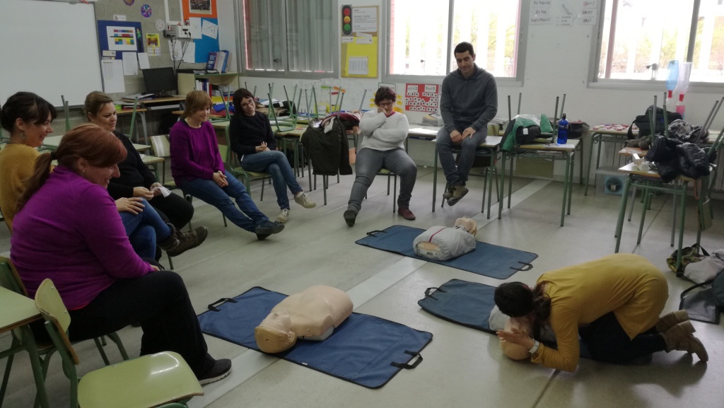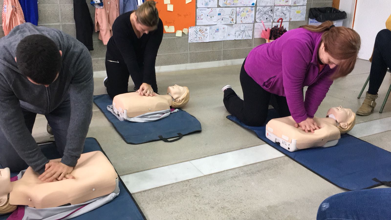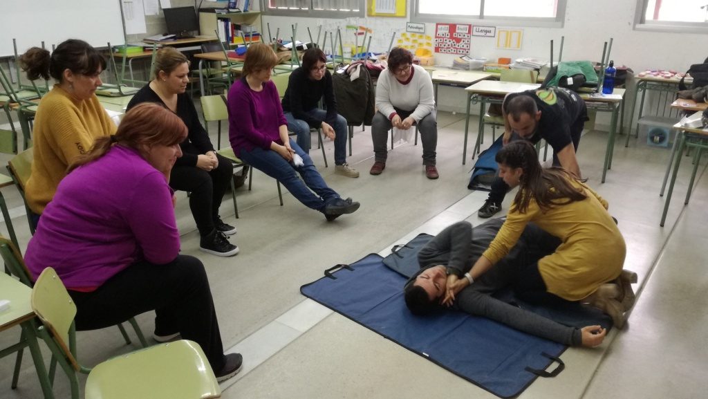 Amb l’objectiu de formar-nos per a conèixer els passos necessaris per atendre a qualsevol persona conscient o inconscient que ens puguem trobar, tant al centre com al carrer, els formadors van guiar-nos per dur a la pràctica tot allò indispensable per atendre a una persona en situació de risc. Vam aprendre els passos a seguir en cas d’aturada cardiorespiratoria, la posició lateral de seguretat, les actuacions en cas d’ennuegament i d’ofegament… Uns coneixements dels que disposarem en cas de necessitat d’emergència. El grup de personal de l’escola vam compartir formació amb representant del cos de Bombers, de la Policia Local, de l’equip de conserges de l’Ajuntament i de membres d’una família particular.